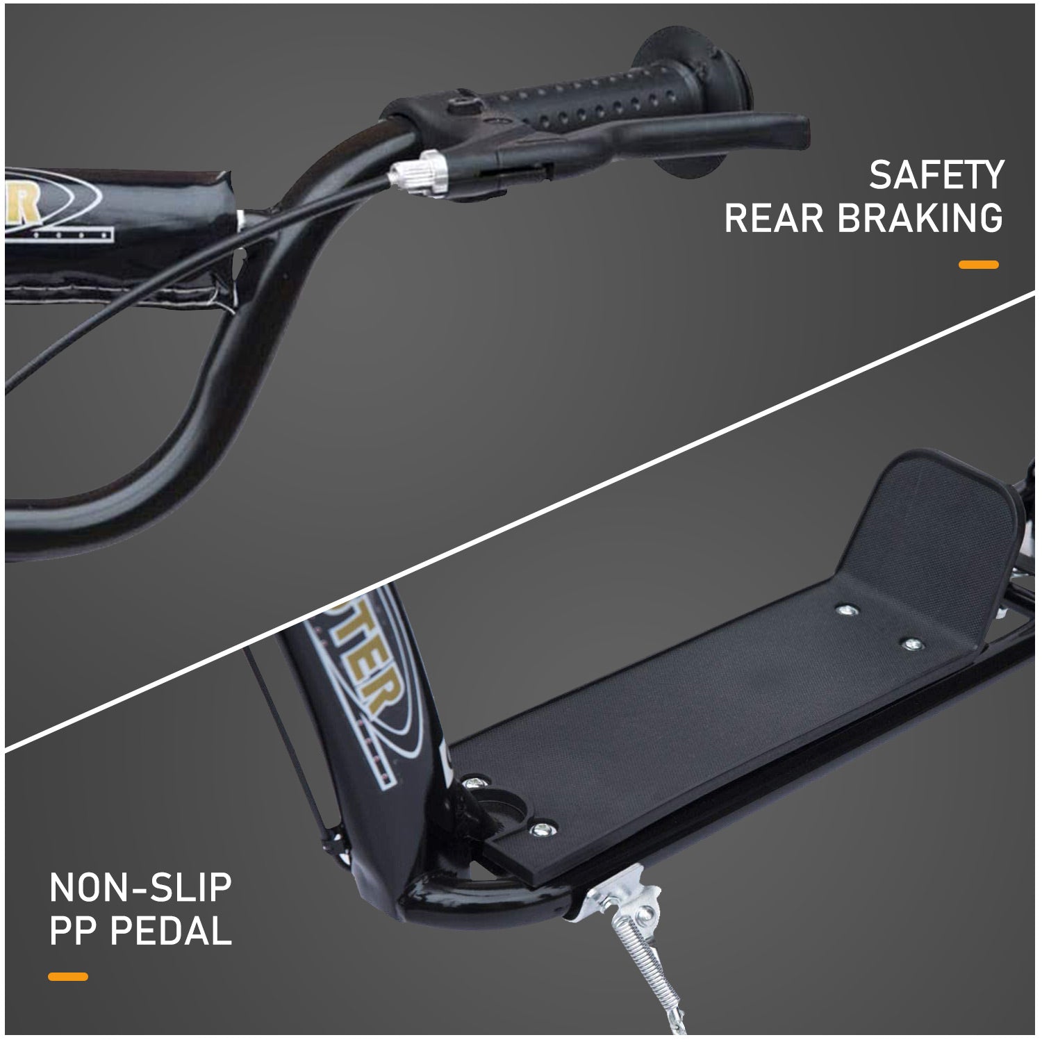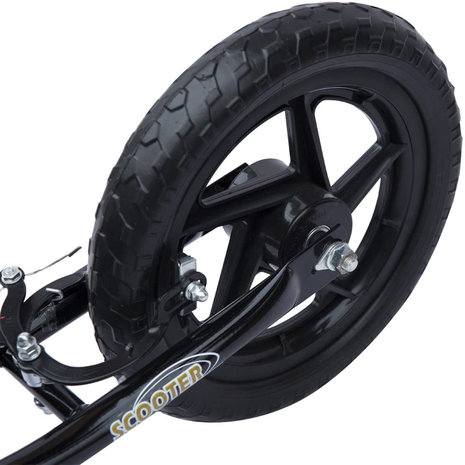 - SAFE TO USE: Brakes on the rear wheel for a swift stop. Wide non-slip deck of the offroad scooter for balance when scootering. Two 12" foam wheels with plastic disks for a smooth ride.