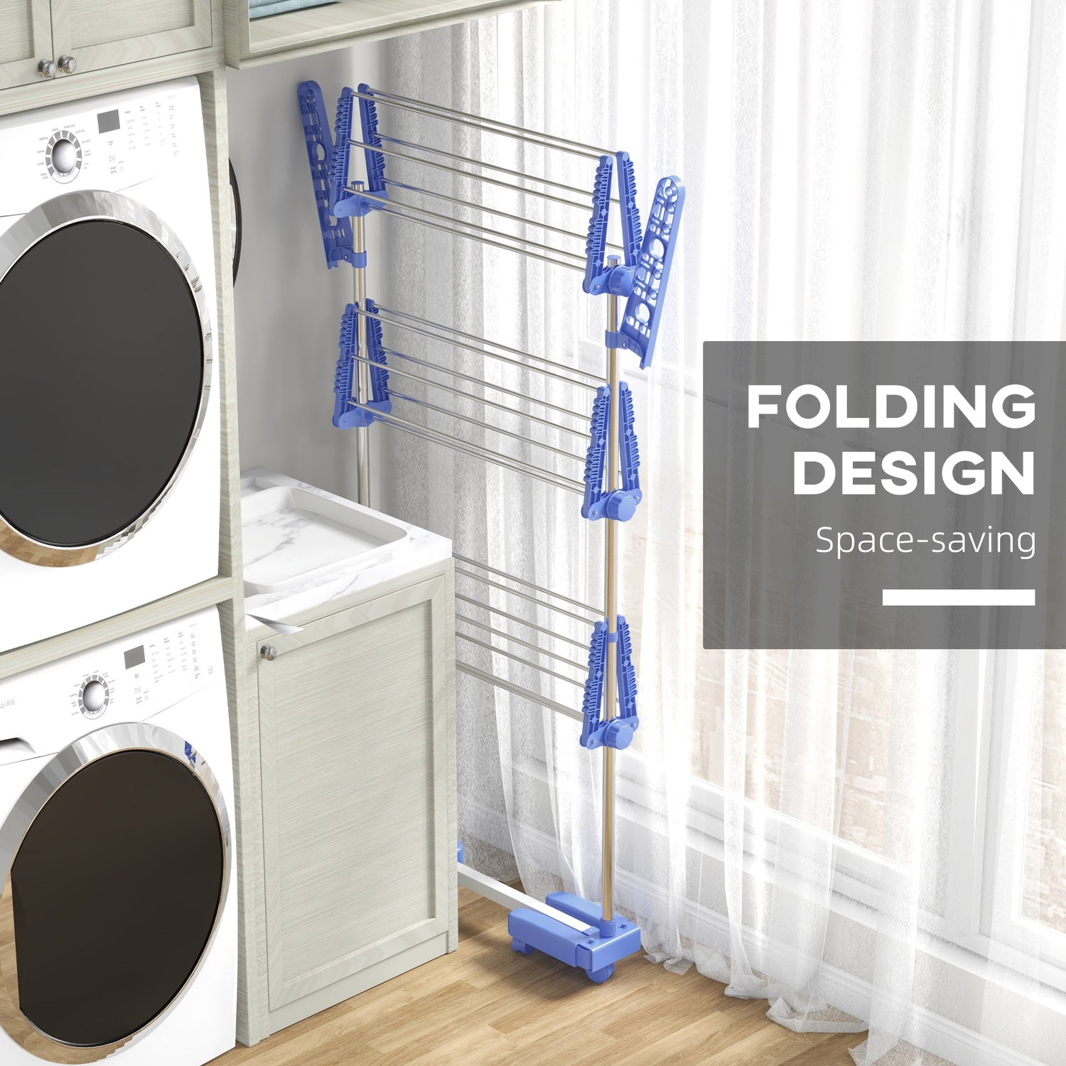 HOMCOM Three-Shelf Collapsing Clothes Horse, With Side Arms and Wheels - Blue