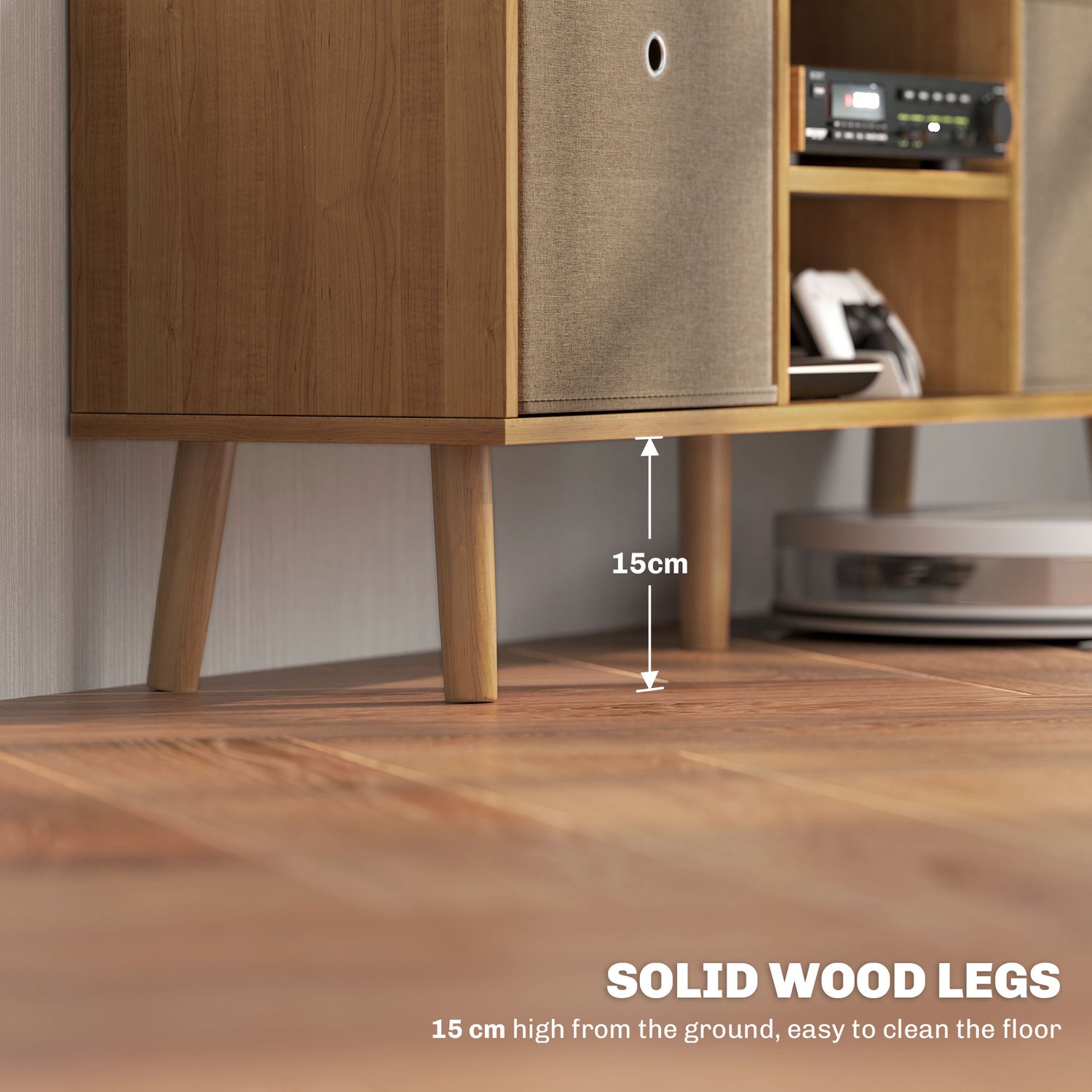 - FIVE WOODEN LEGS: Slightly angled for extra balance, supports the storage unit, with a middle leg for extra strength. 15cm - keeps items inside the TV table safe from floor, easy to clean under.