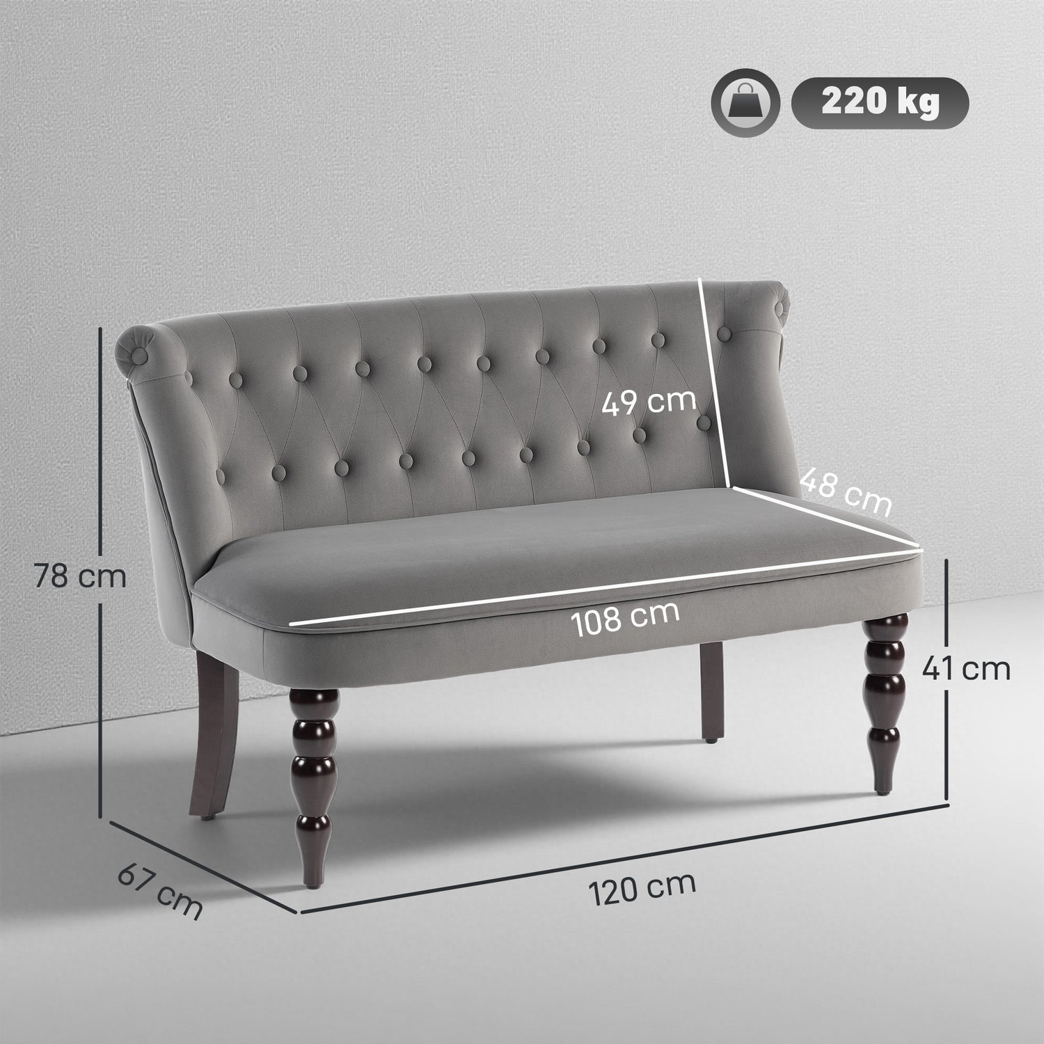 - Dimensions: 78H x 120W x 67DCM. Seat: 41H x 108W x 48Dcm. Maximum load 220kg. Assembly required. Made from flame retardant materials.