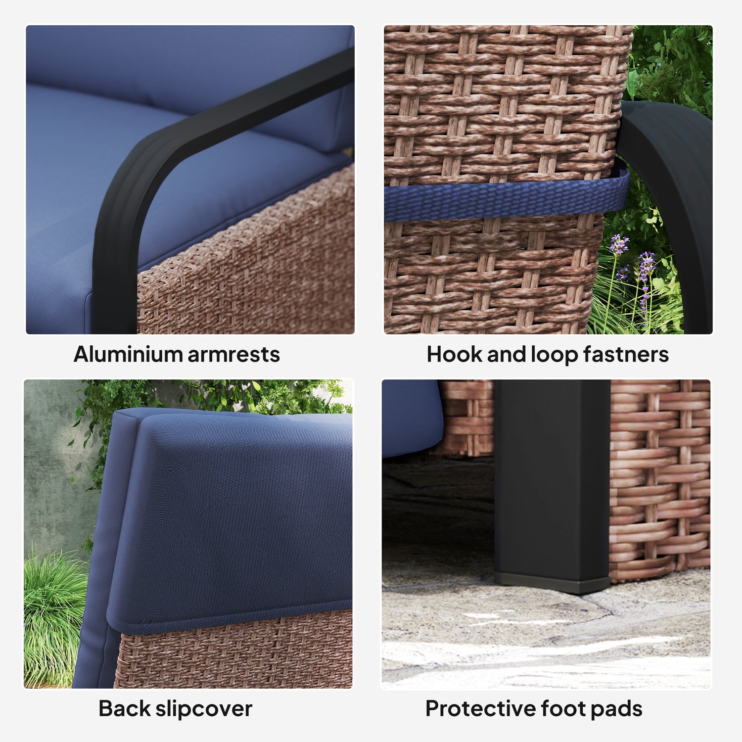 - Aluminium and steel blend frame for a strong core, wrapped in double-strand plastic rattan