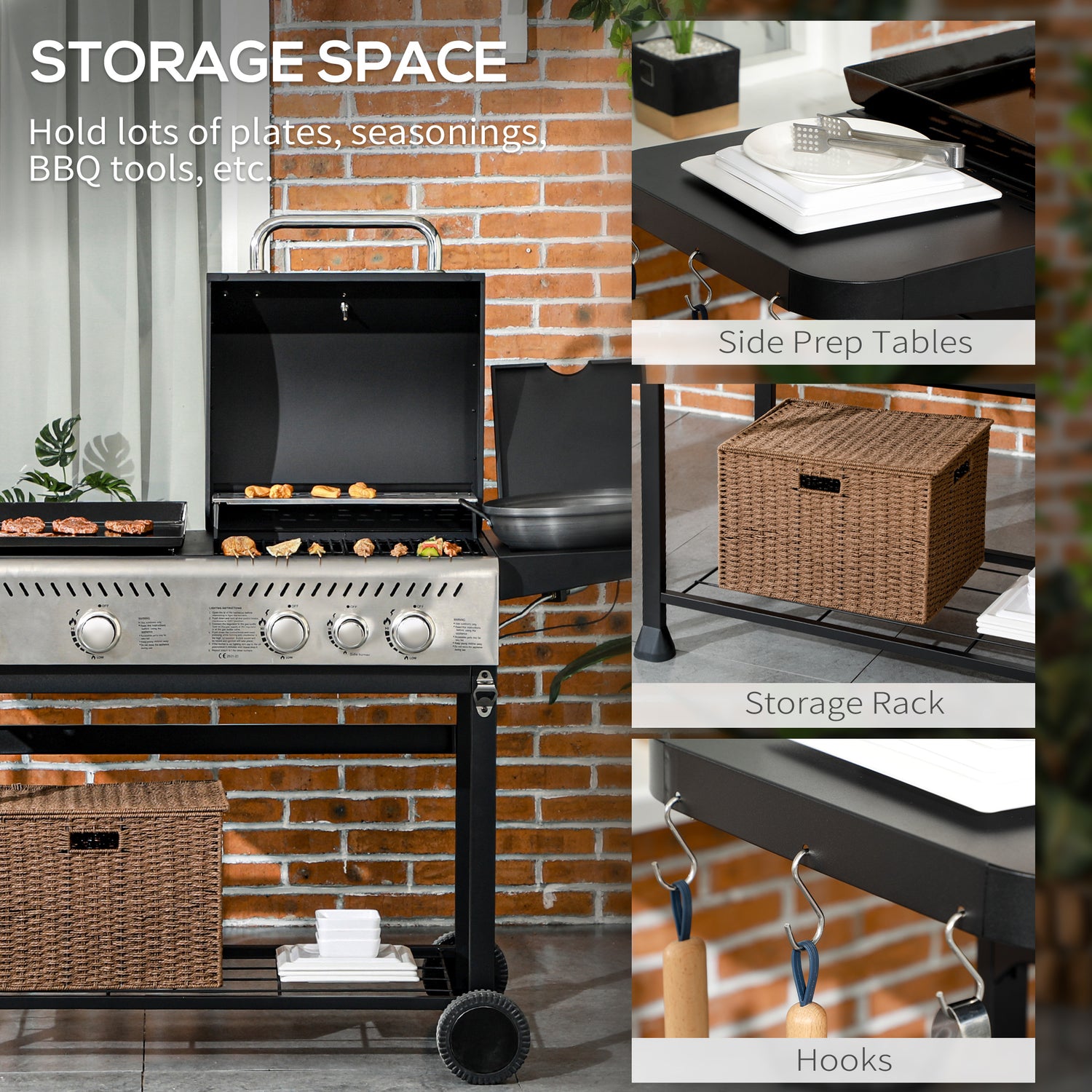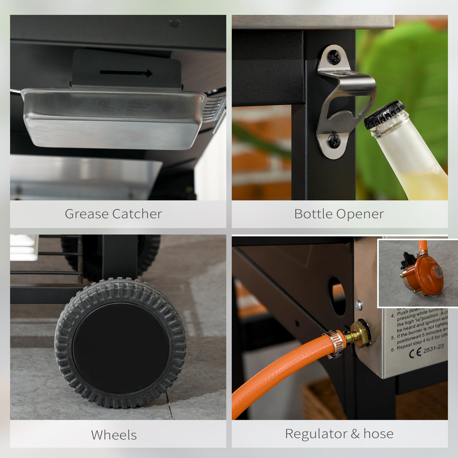 Sizzle and sear like a pro with the Outsunny 2-in-1 gas bbq and plancha grill. Cater to crowds with a generous 3906 cm² cooking surface, enough for 8-16 servings. The gas grill's built-in lid and thermometer allow you to cook according to different ingredients and flavours, while the side burner adds extra sizzle. Keep your culinary tools handy with convenient storage racks and hooks and roll out feasts effortlessly with its portable wheeled design.