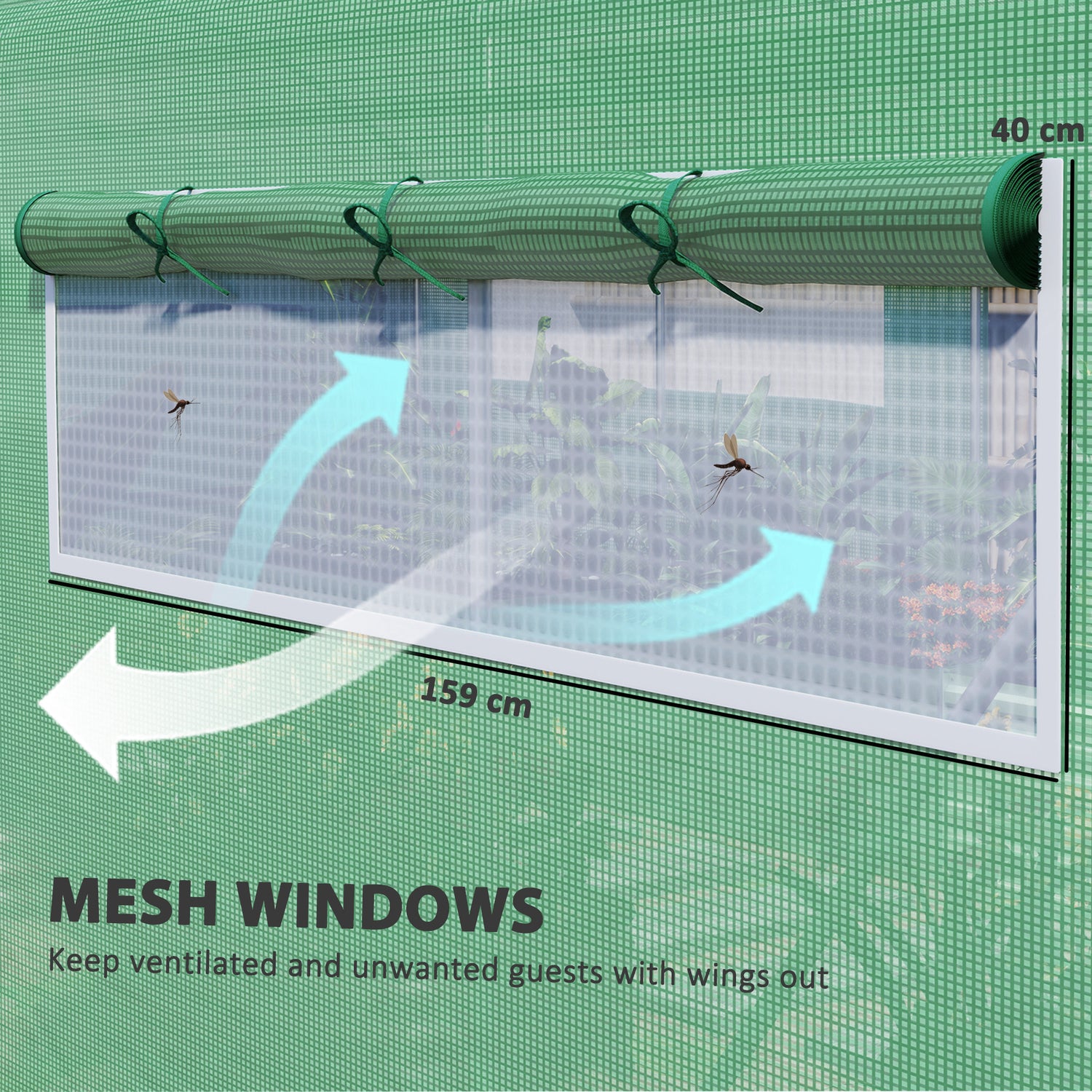 Year-round gardening with plenty of space and protection, with this Outsunny polytunnel greenhouse. Three roll-up doors and multiple mesh windows allow easy access and plenty of fresh air. Fitted with a 140gsm plastic cover for a protective shell - shields inside fromlight weather and allows sunlight to pass through for beautiful growth. Complete with four ground stakes and four guy ropes in the package to pin greenhouse to the ground.