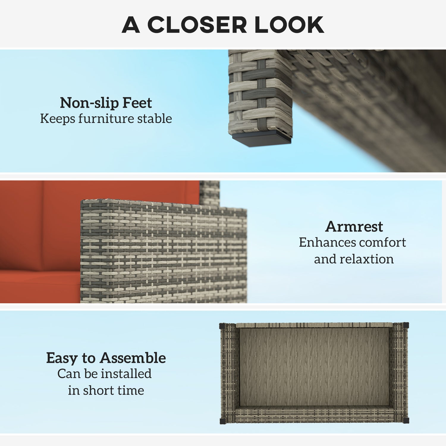 - Metal wrapped in rattan: The comfy outdoor sofa made of steel frame with powder-coated process to ensures a strong and stable base, with PE wicker wrapped around for protection against mild weathering and fading.