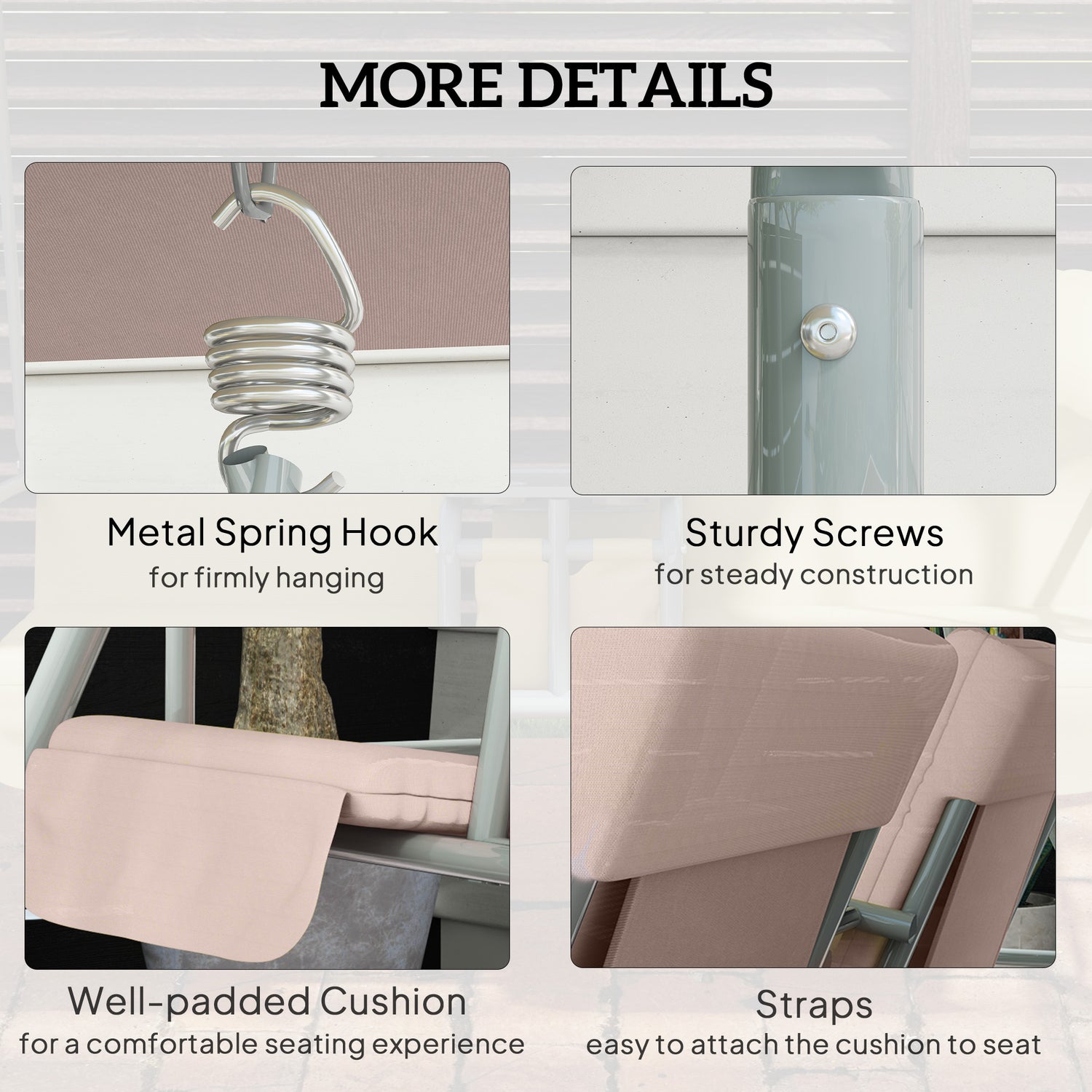 - Padded seats: Keeps you comfortable as you relax. Tie fastenings on the corners to secure to the frame.