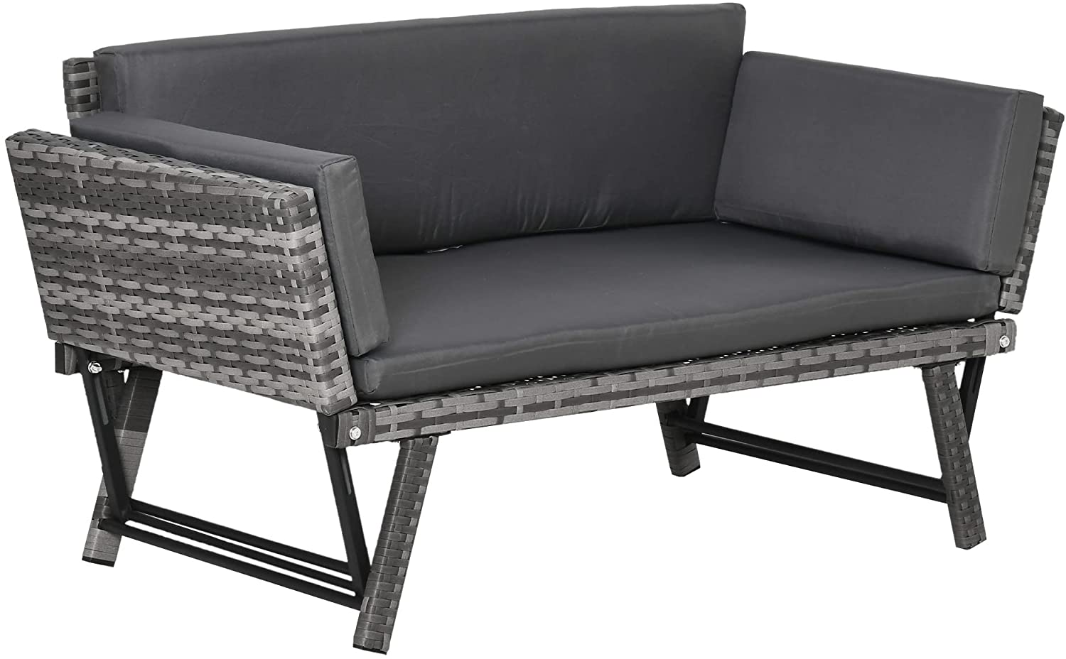Outsunny 2-Seater Rattan Folding Daybed Sofa Bench Garden Chaise Lounger Loveseat with Cushion Outdoor Patio Grey