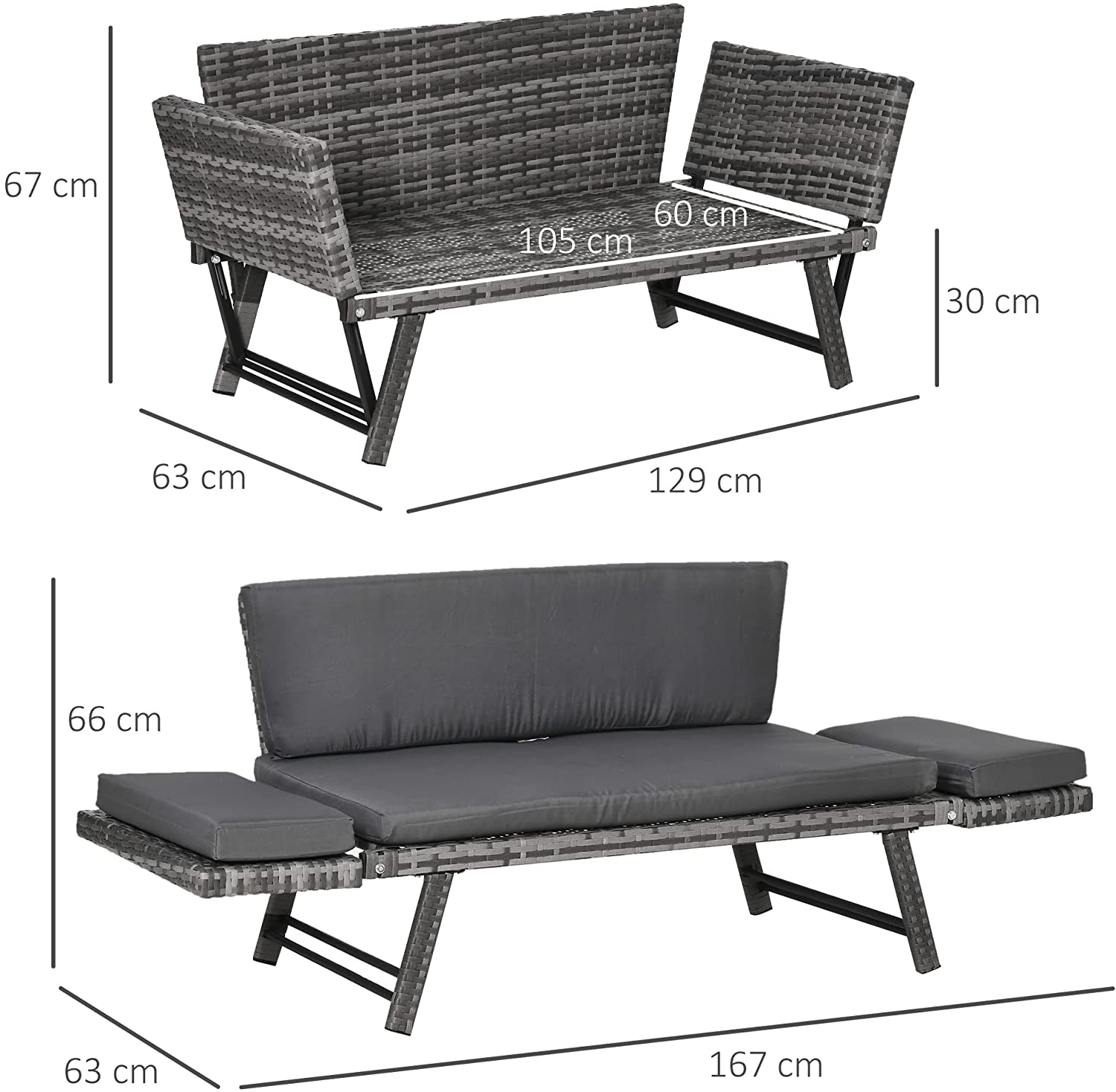 Make your outdoor times even better than before with this convertible sofa from Outsunny. A 2-in-1 design, it features side armrests that can be left up or down, giving you a greater choice when choosing how you want to relax outdoors. Reinforced steel is used to ensure strength and stability, with PE rattan hand woven protecting the bed from light weather damage. It's finished with thick padded cushions, a great way to laze a sunny afternoon away.