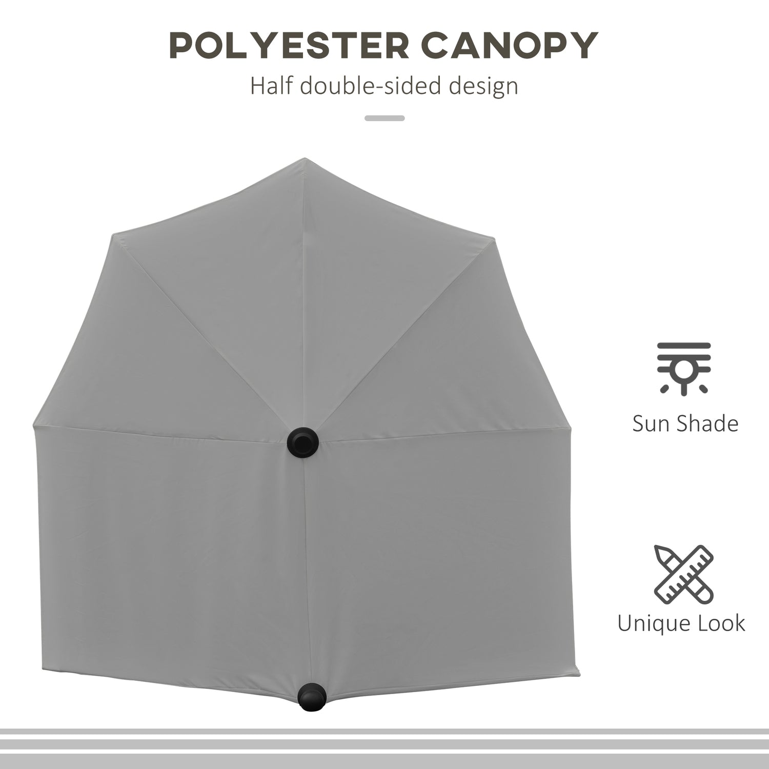 - HALF-CUT DESIGN, DOUBLE-SIDED CANOPY: Parasol umbrella is specially designed to stand against a wall, window or fence, great for small garden and outdoor spaces - such as balconies, small patios, front porches and more garden and outdoor spaces. Extended canopy for extra shade.