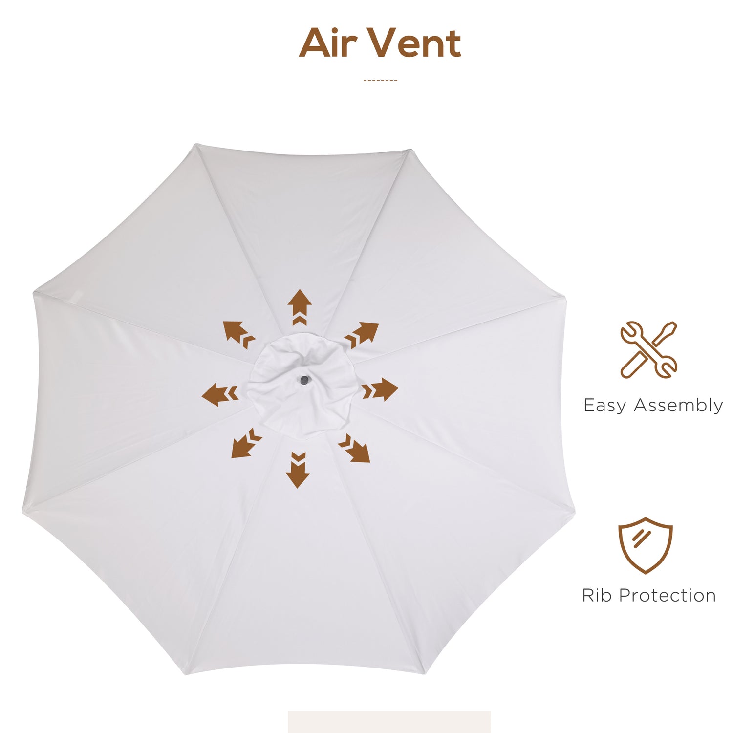 - Top vent: Allows air to pass through the canopy gently, helping to reduce build-up and in turn, helps prevent garden parasol canopy turning inside out.