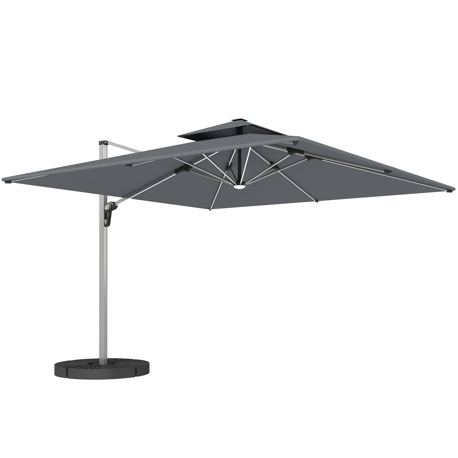 Transform your garden into a blissful escape with the Outsunny cantilever parasol with base included. This outdoor umbrella for garden offers expansive shade, suitable for lounging or hosting. Featuring a rust-proof aluminium pole and vibrant 250 gsm yarn-dyed fabric with PA coating, it promises lasting colour and durability. Plus, enjoy enchanting evenings under the glow of 15 LED light strips powered by solar energy.
