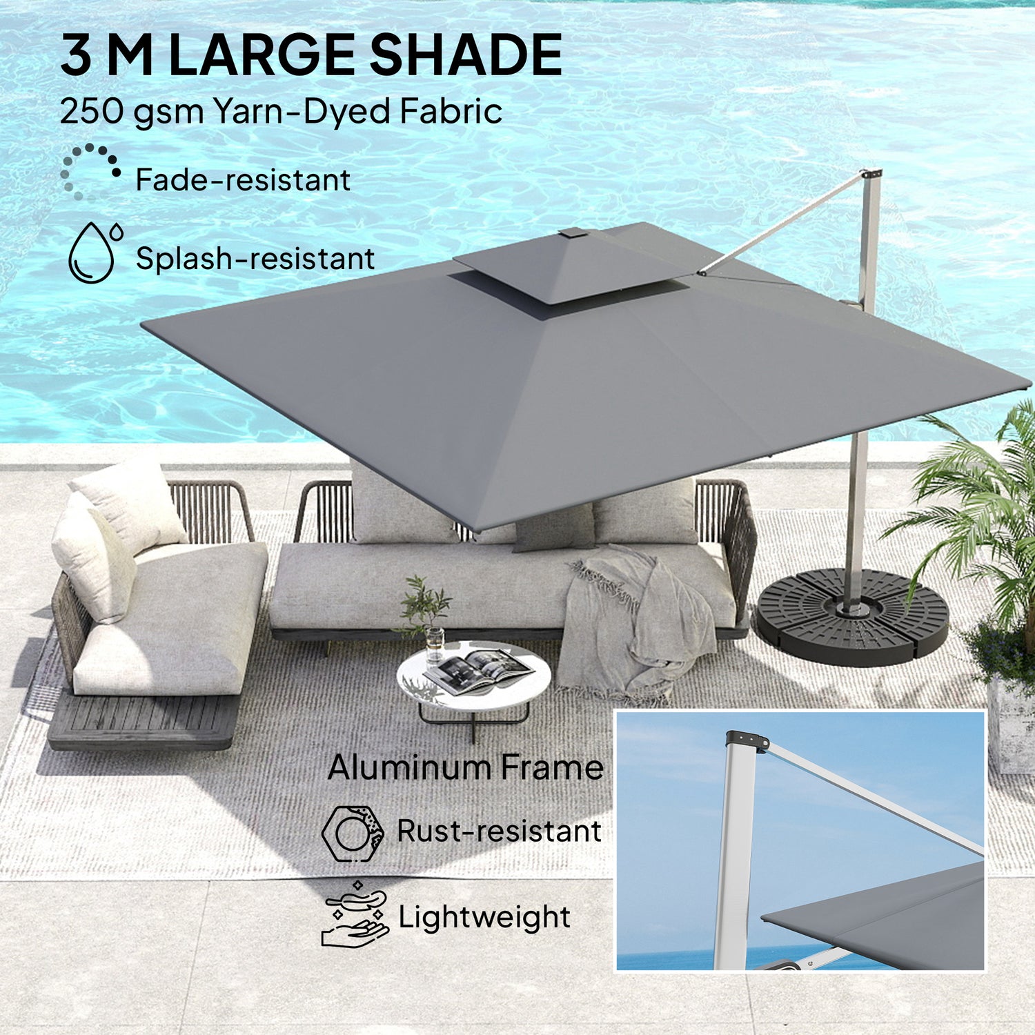 - Spacious & stylish shade: This 3(m) cantilever umbrella provides lots of coverage, suitable for patios, outdoor dining and gatherings. Made with 250 gsm yarn-dyed fabric and a PA coating, it resists fading and stays vibrant season after season.