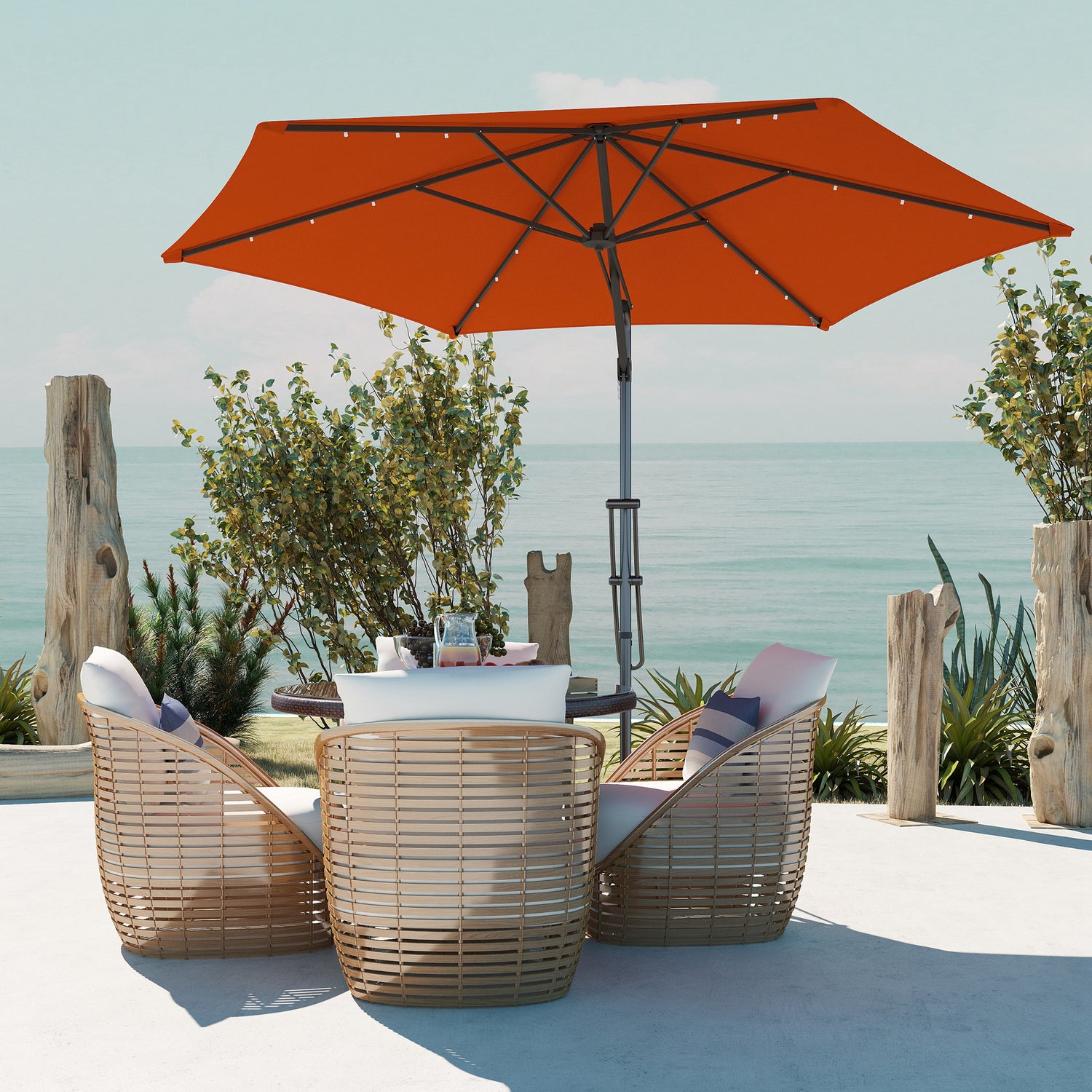 - Solar-powered LED lights: Up to five hours of light, after a four-hour charge. LED parasol creates an illuminated space when dark.
