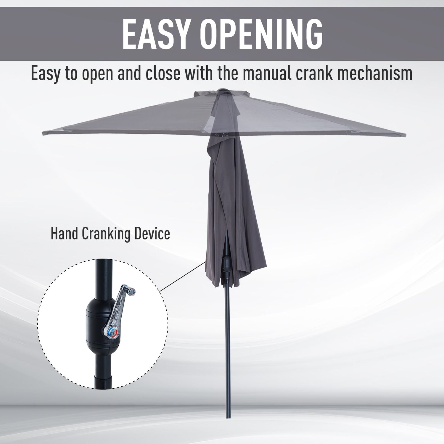 - CRANK MECHANISM: Open and close the half garden parasol in seconds with the easy-to-turn handle located on the side of garden parasol pole.