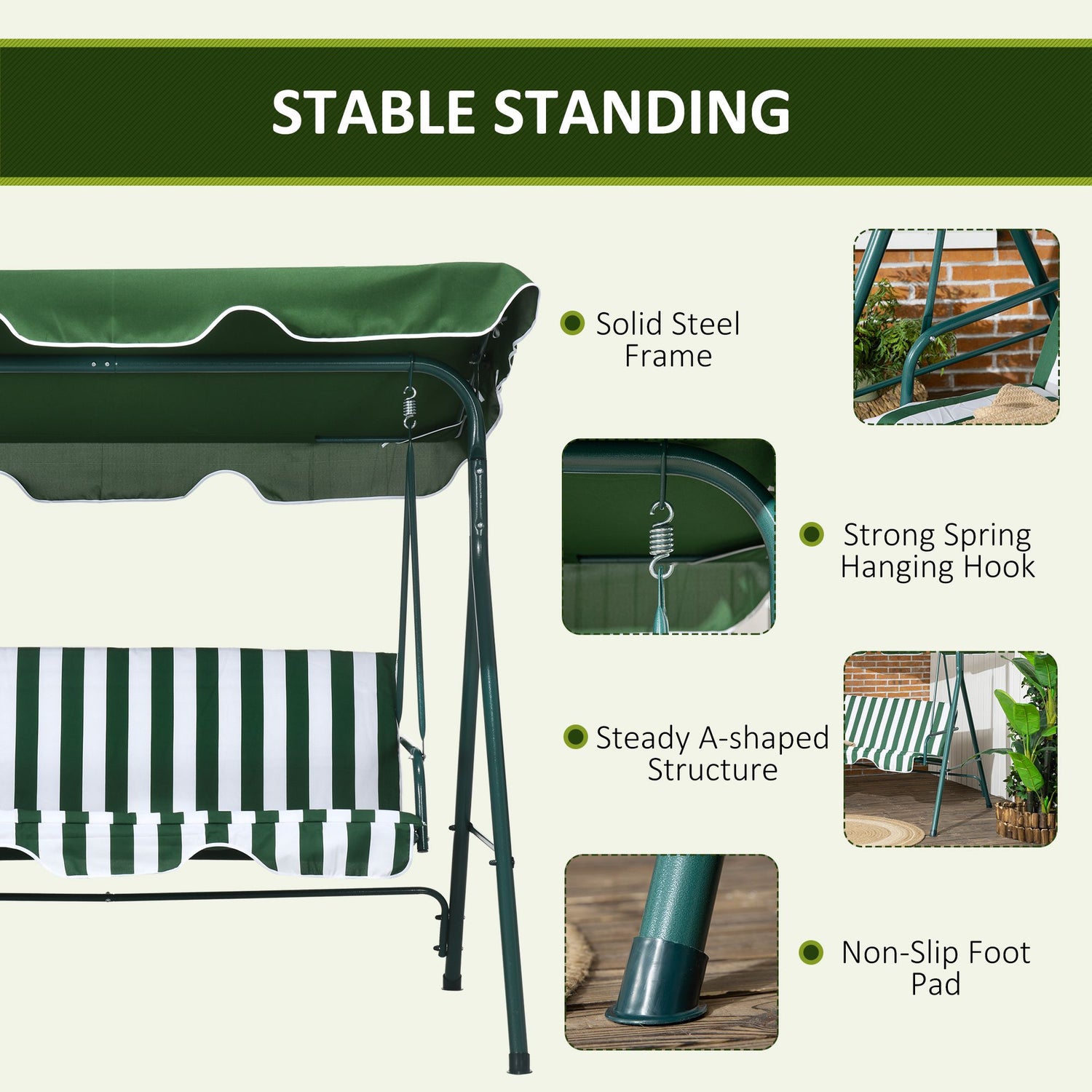 Relax in style and comfort - do it with this Outsunny garden swing chair. Seats up to three people: plenty of room to relax with friends or grab extra room for yourself. The adjustable angle shields you from mild weather above at different positions. With a padded seat and high back, you'll be relaxing comfortably and with support. Sport stripes for style, this season and beyond!