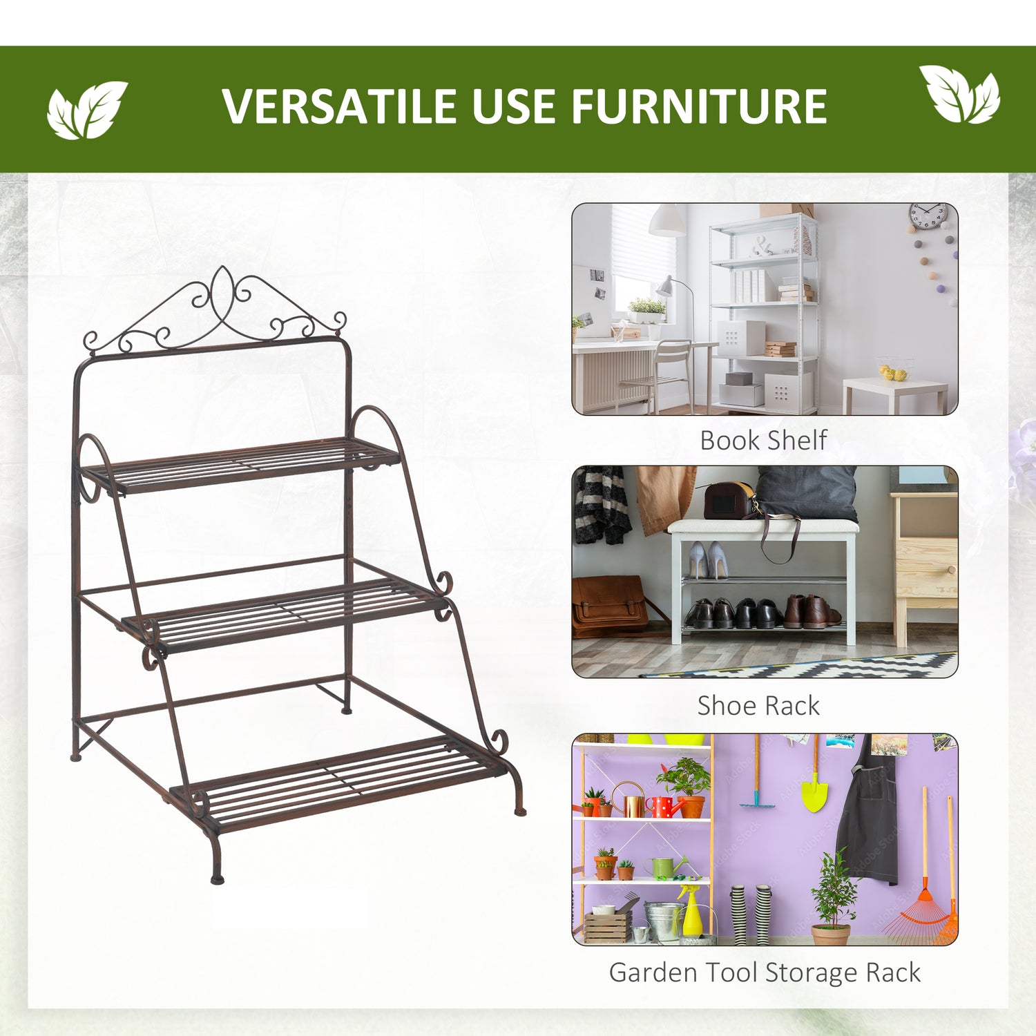Add style and storage to your home with this tall plant stand from Outsunny. Our 3-tiered flower stand is built with a gorgeous sturdy metal scroll work frame, the plant shelf brings a touch of elegance to your porch, patio, indoor space, or wherever you want to utilize it. This tiered plant stand is perfect for holding everything from plants to books to decorative candles. With this corner plant stand, you can easily keep your surrounding area neat, tidy, and stylish!