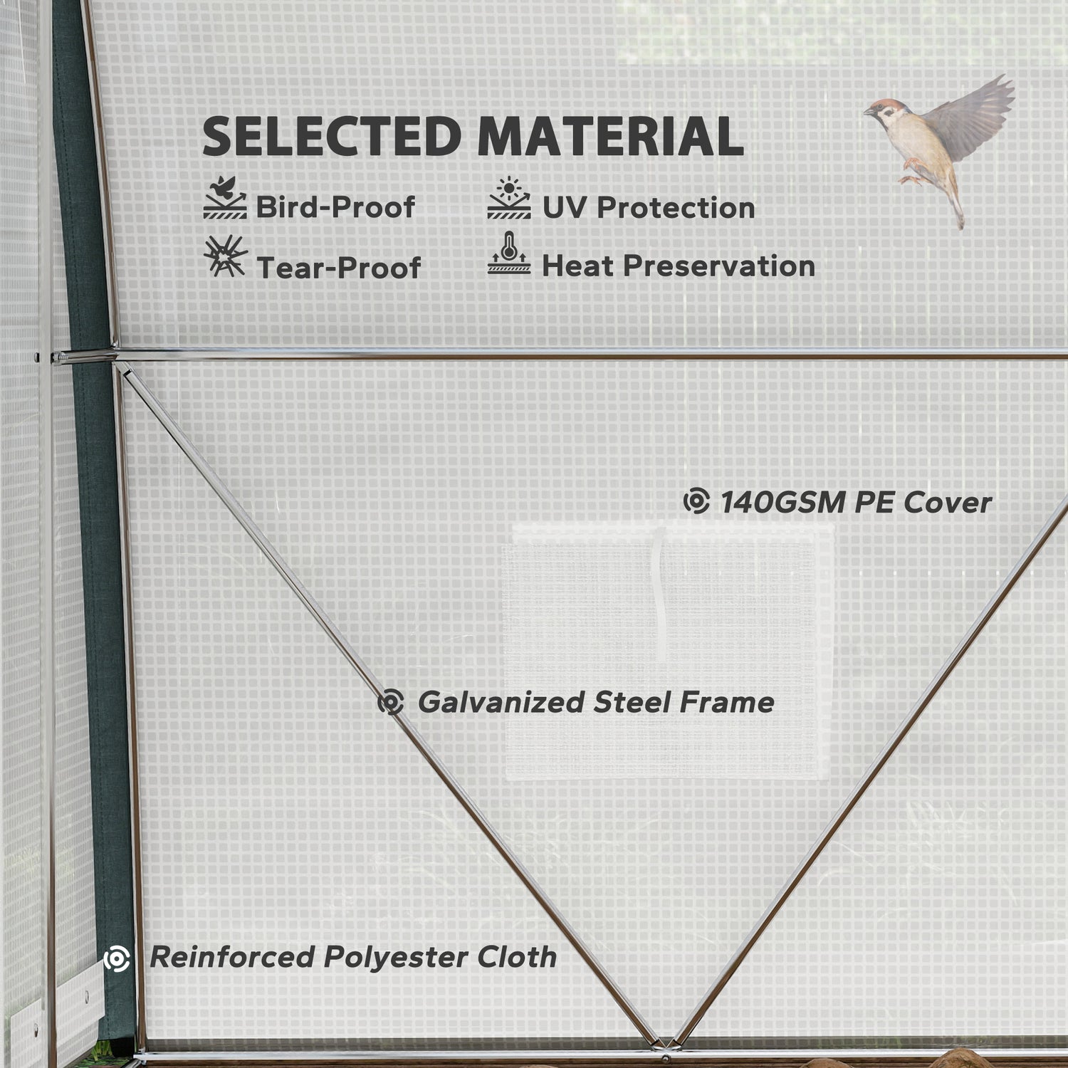 - Two-layer plastic cover: With a middle reinforcement grid to help prevent tearing. 140 gsm for a protective shell, whilst allowing 85% sunlight through for natural nourishment. 15cm edge to bury into soil