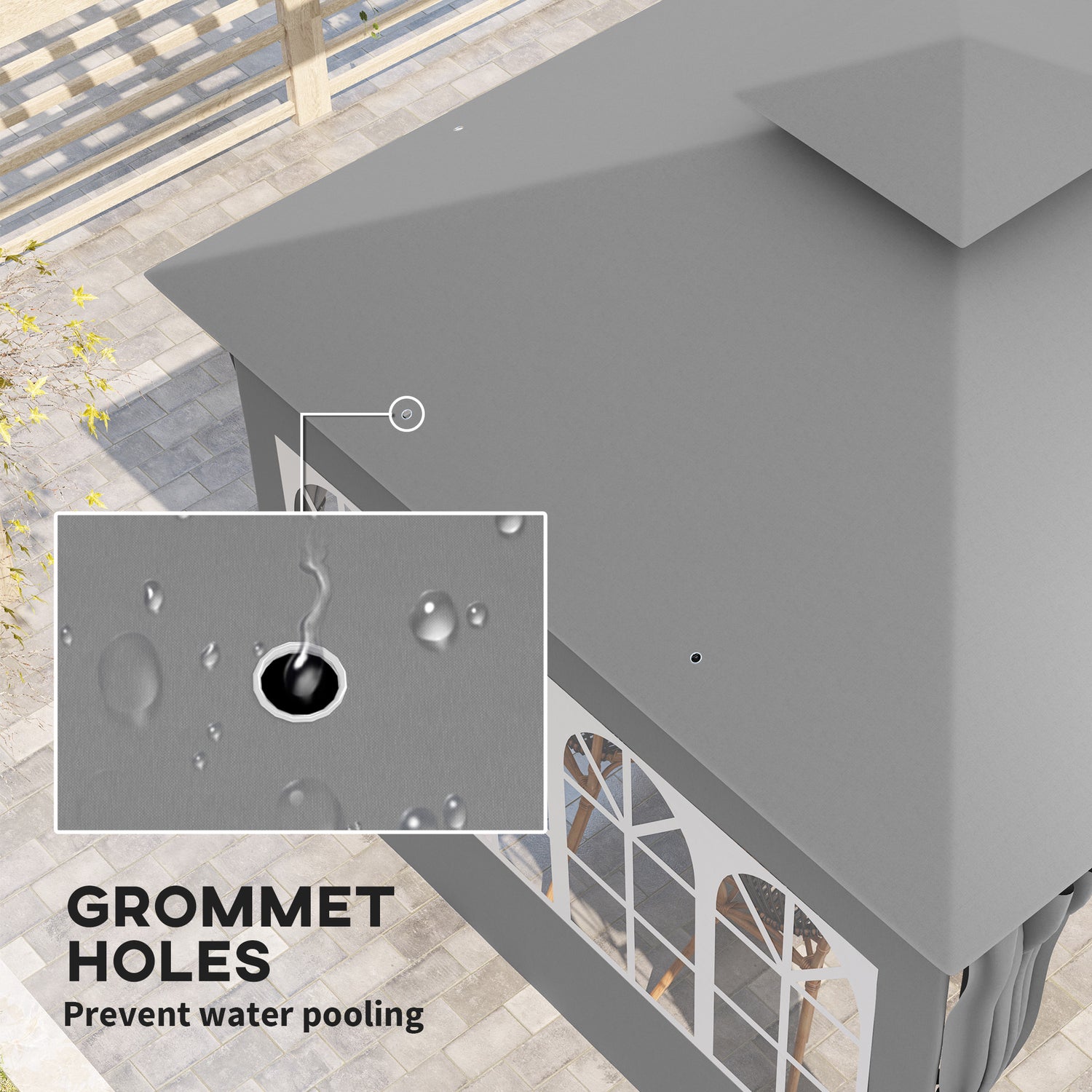 - Weather-resistant design: The permanent gazebo features a PA-coated double-tier roof for enhanced airflow and UV protection, alongside a splash-resistant polyester canopy with eight grommet holes to prevent water pooling.