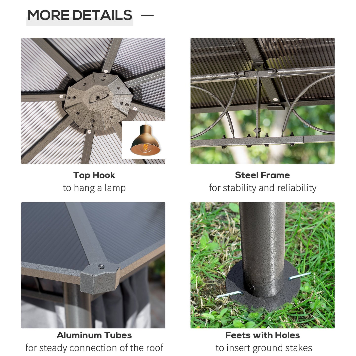 - STURDY ROOF: The hard top gazebo's roof is made with 6mm brown polycarbonate for stability, which is UV and water resistant to protect from harmful UV rays or light rain. The pointed roof design allows rainwater to flow down from the top to prevent water accumulation.