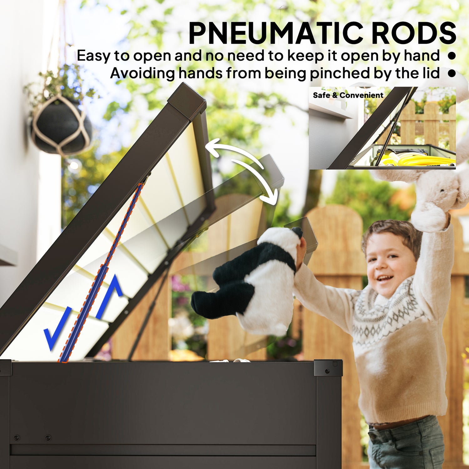- Convenient & safe to use: Equipped with two pneumatic rods, the lid of this outside storage box opens smoothly and stays open safely, preventing sudden closures and protecting your hands from being pinched.