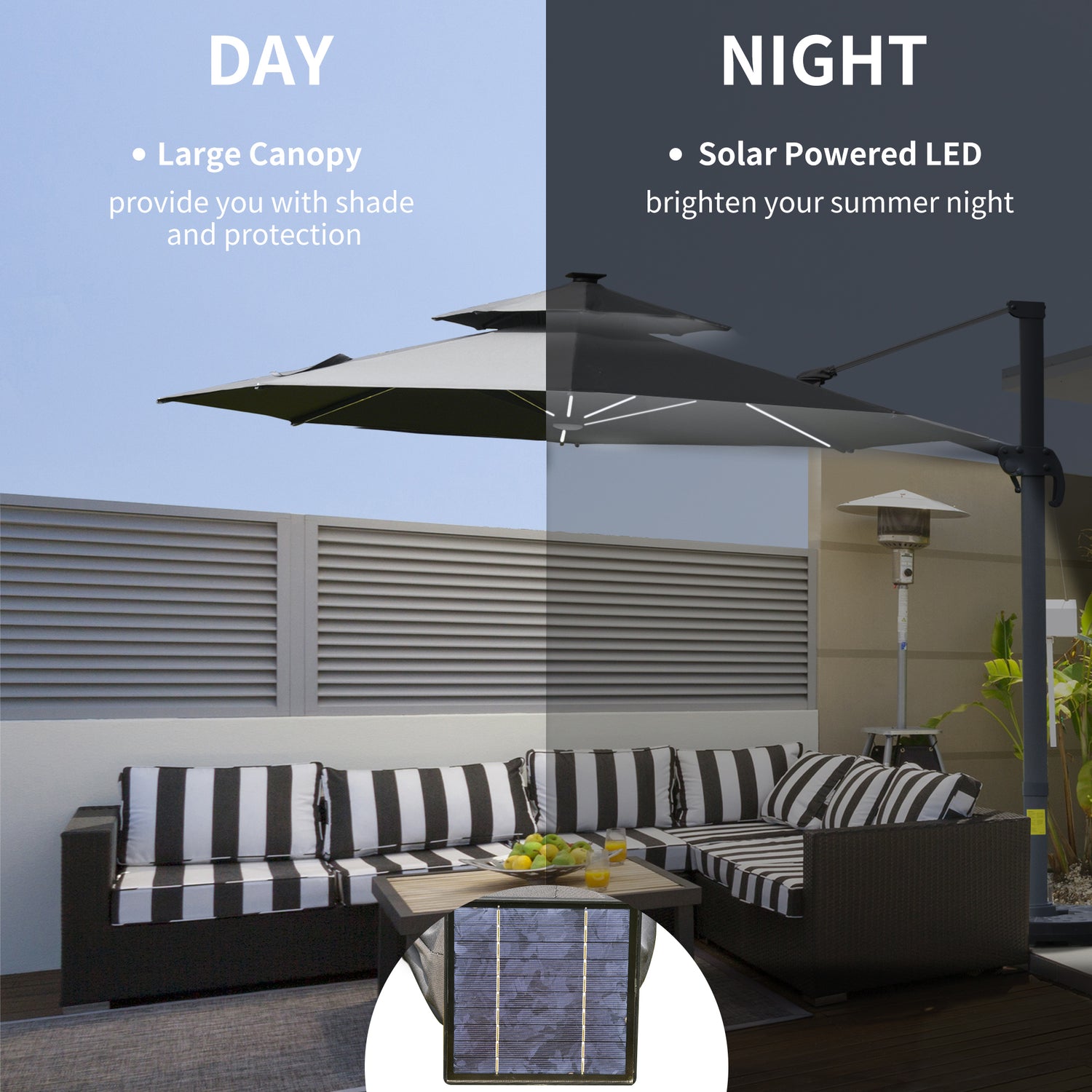 Outsunny 3m Cantilever Parasol w/ Solar Lights Power Bank Base 360° Spin Dark Grey