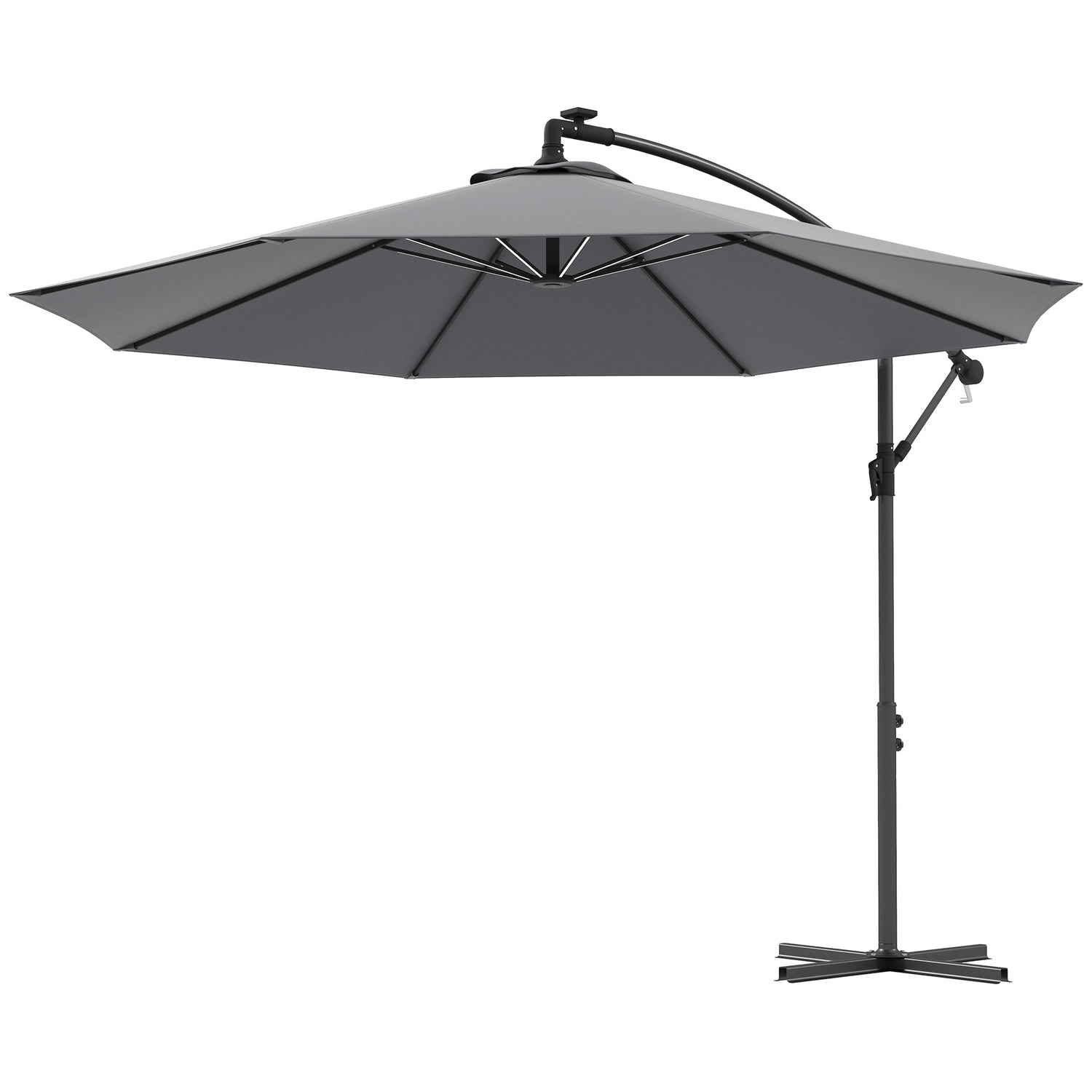 Outsunny 3(m) Cantilever Parasol with Solar LED Lights, Garden Umbrella with Cross Base and Crank Handle, Hanging Offset Banana Sun Shade for Outdoor, Patio, Grey