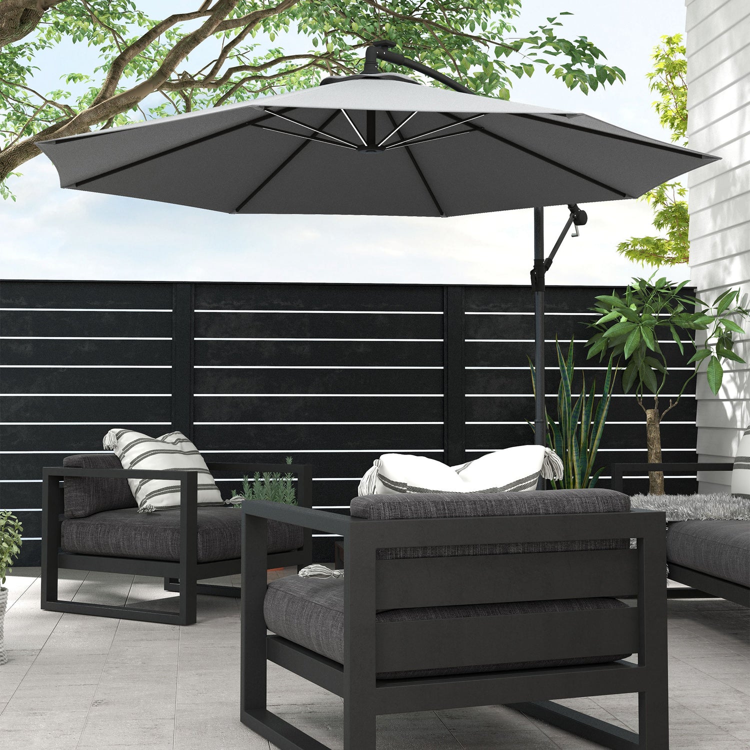 - Offset cantilever umbrella: This 3(m) round offset cantilever umbrella can cover large patio furniture that doesn't have a hole to mount a standard umbrella to. Use it to cover outdoor sectionals, pool lounge chairs, or patio dining sets to provide comfortable shade even in difficult situations.