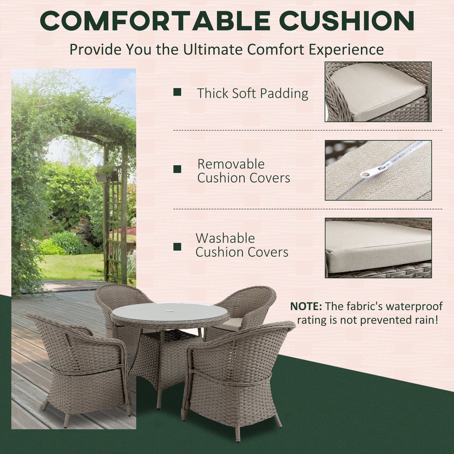 - Five-piece garden dining set: The outdoor garden furniture set comes with four dining armchairs and a matching round dining table. A way to bring family/friends together in your garden and outdoor areas.