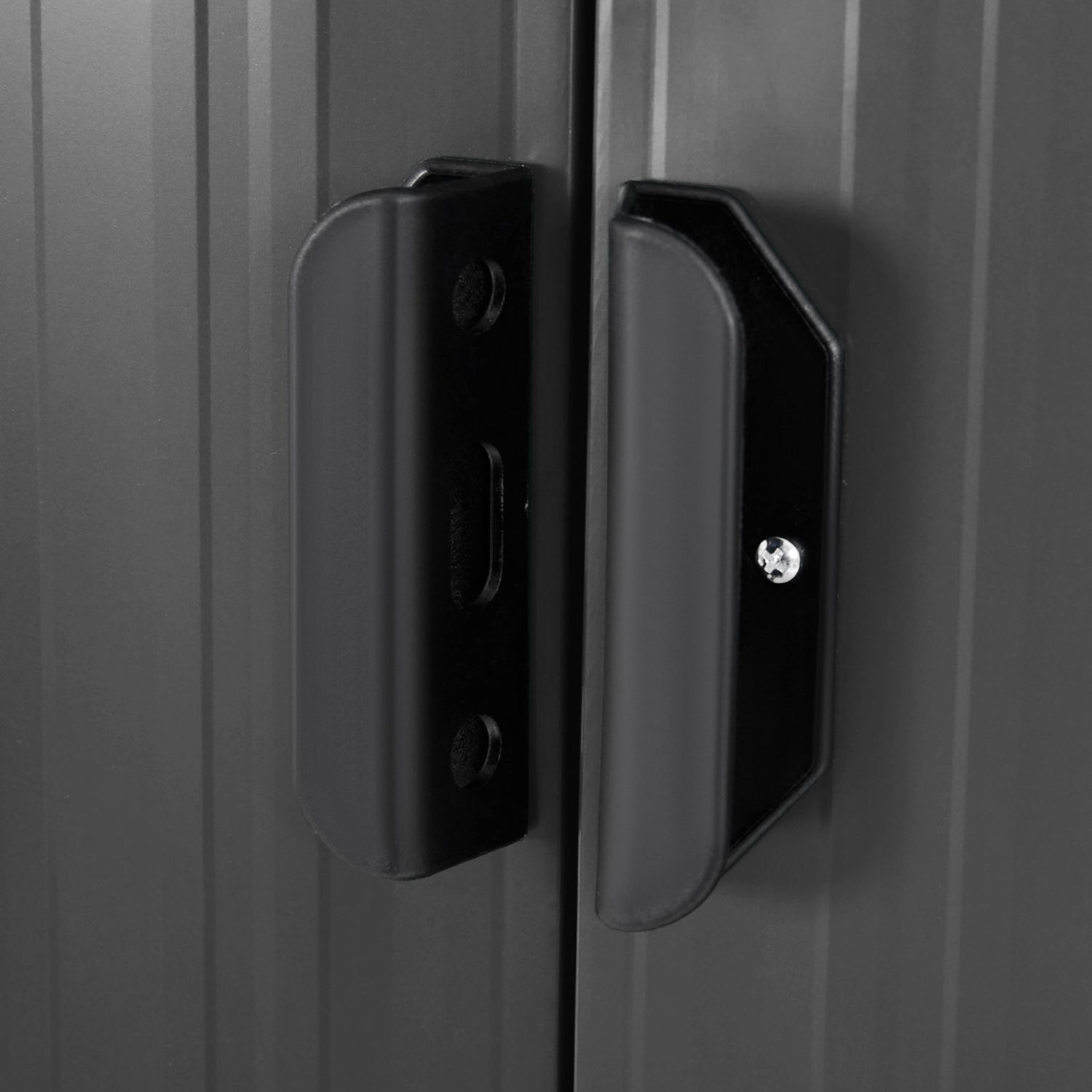 - Corrugated metal structure: Strong formation, shed stands steady and safely houses the inner items. Sloped roof to prevent rainwater build-up.