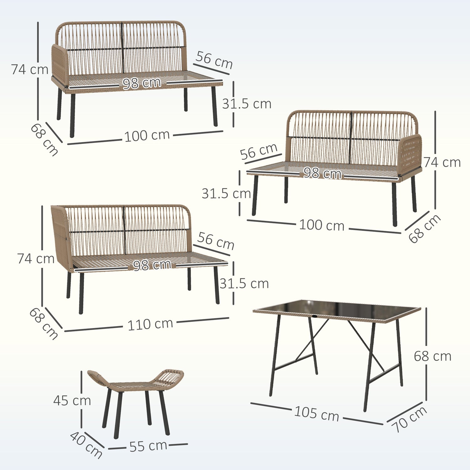 Transform your garden into a relaxing haven with the Outsunny 6-piece garden sofa set. This versatile outdoor garden furniture includes two left/right-hand sofas, a cosy corner sofa, a table and two stools, all designed for customizable configurations. Crafted with robust steel and wrapped in all-weather wicker PE rattan, paired with plush cushions, it's a great choice for outdoor lounging.