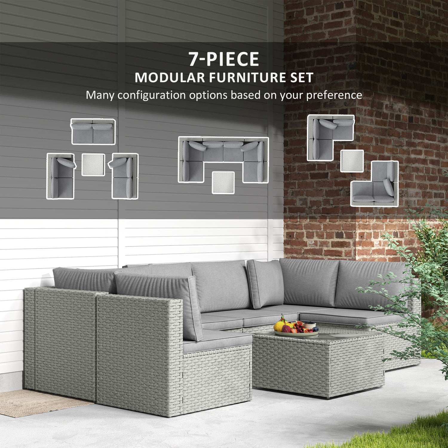 Outsunny 7-Piece Rattan Garden Furniture Set, 6-Seater Corner Sofa with Cushions, Glass Table, Outdoor Conservatory Set, Grey