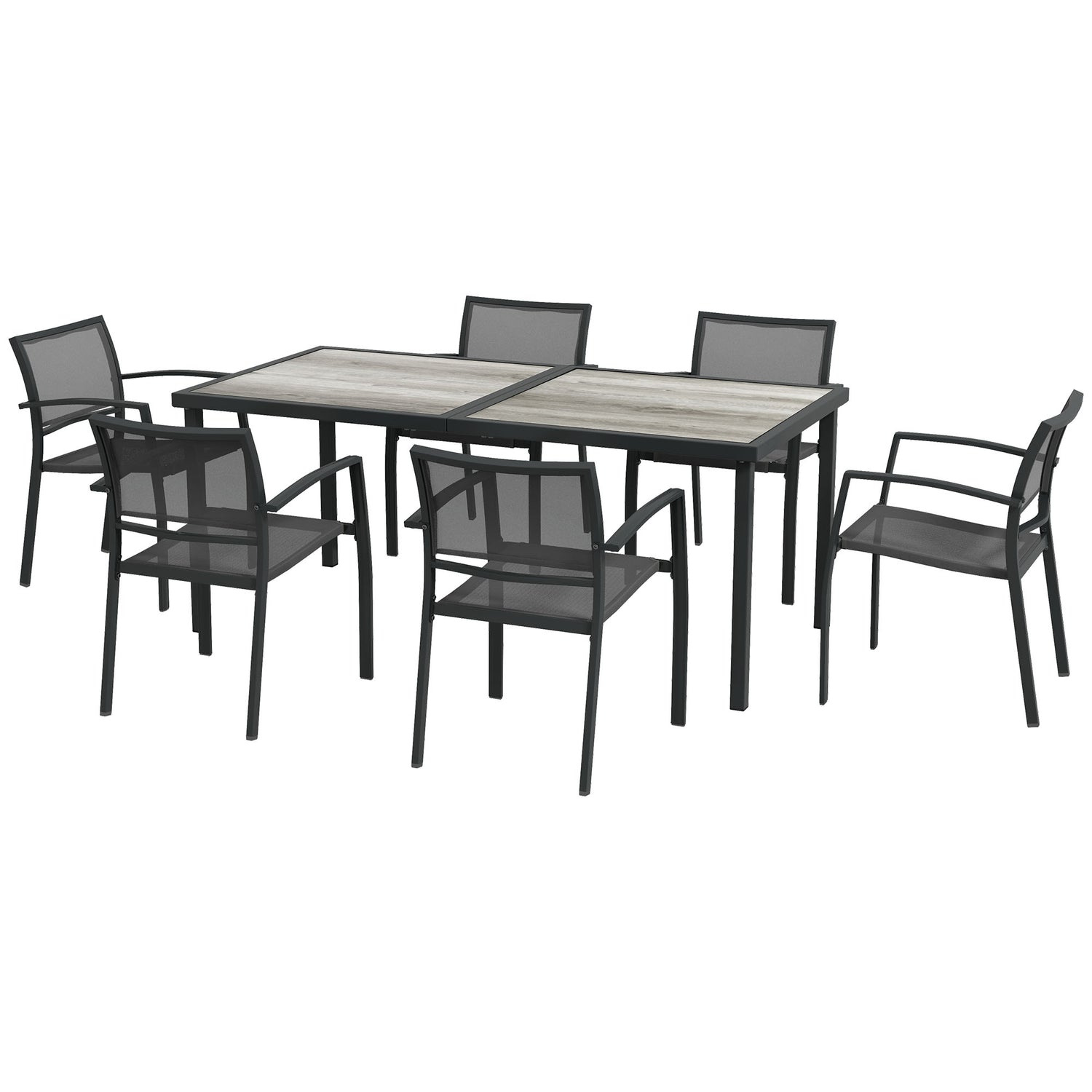 Let the rustic design of this Outsunny dining set effortlessly blend in with your outdoors. The multi-tone faded tabletop is beautiful and eye-catching; matches the overall dark aesthetic of the set. Powder coated steel frames mean strong and supportive pieces; the chairs have mesh fabric to hold you comfortably. Set comes with one large dining table and six chairs - enjoy outdoors with company.