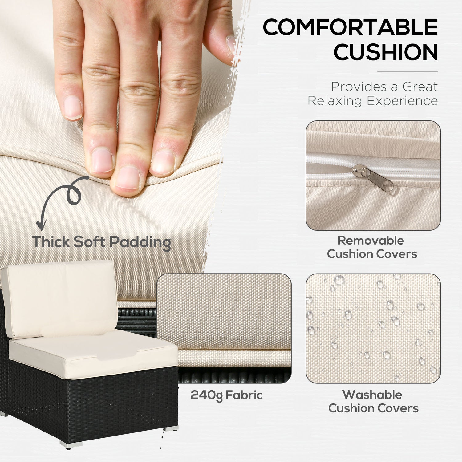 Make your garden stand out like never before. Say hello to this Outsunny garden corner sofa set. Each piece has a steel frame for strong support, wrapped in plastic wicker for double the durability; also creating a forever-stylish set for your outdoor space. Comes with two corner seats, four normal seats, a footstool and table - set up into a shape which you want. Padded cushions for comfort, with four coloured cushions for a touch of bold beauty.