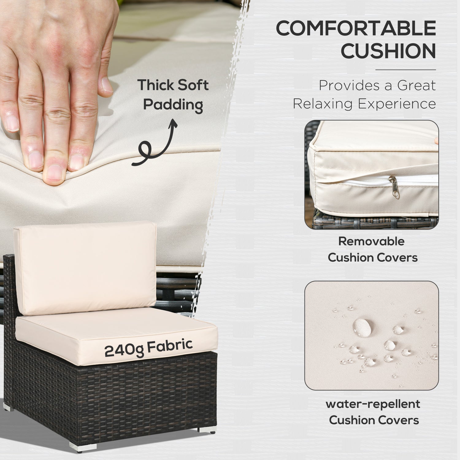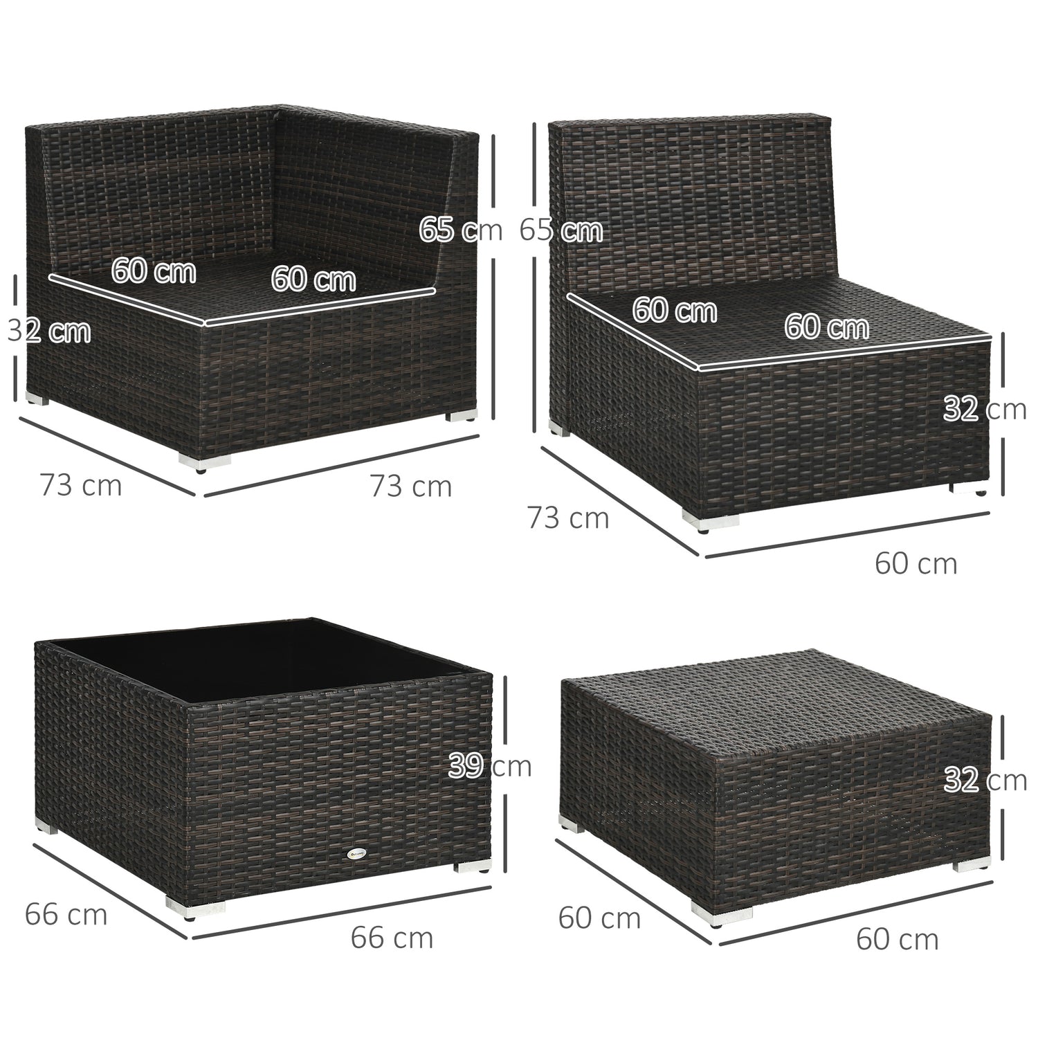 Make your garden stand out like never before. Say hello to this Outsunny garden corner sofa set. Each piece has a steel frame for strong support, wrapped in plastic wicker for double the durability; also creating a forever-stylish set for your outdoor space. Comes with two corner seats, four normal seats, a footstool and table - set up into a shape which you want. Padded cushions for comfort, with four coloured cushions for a touch of bold beauty.