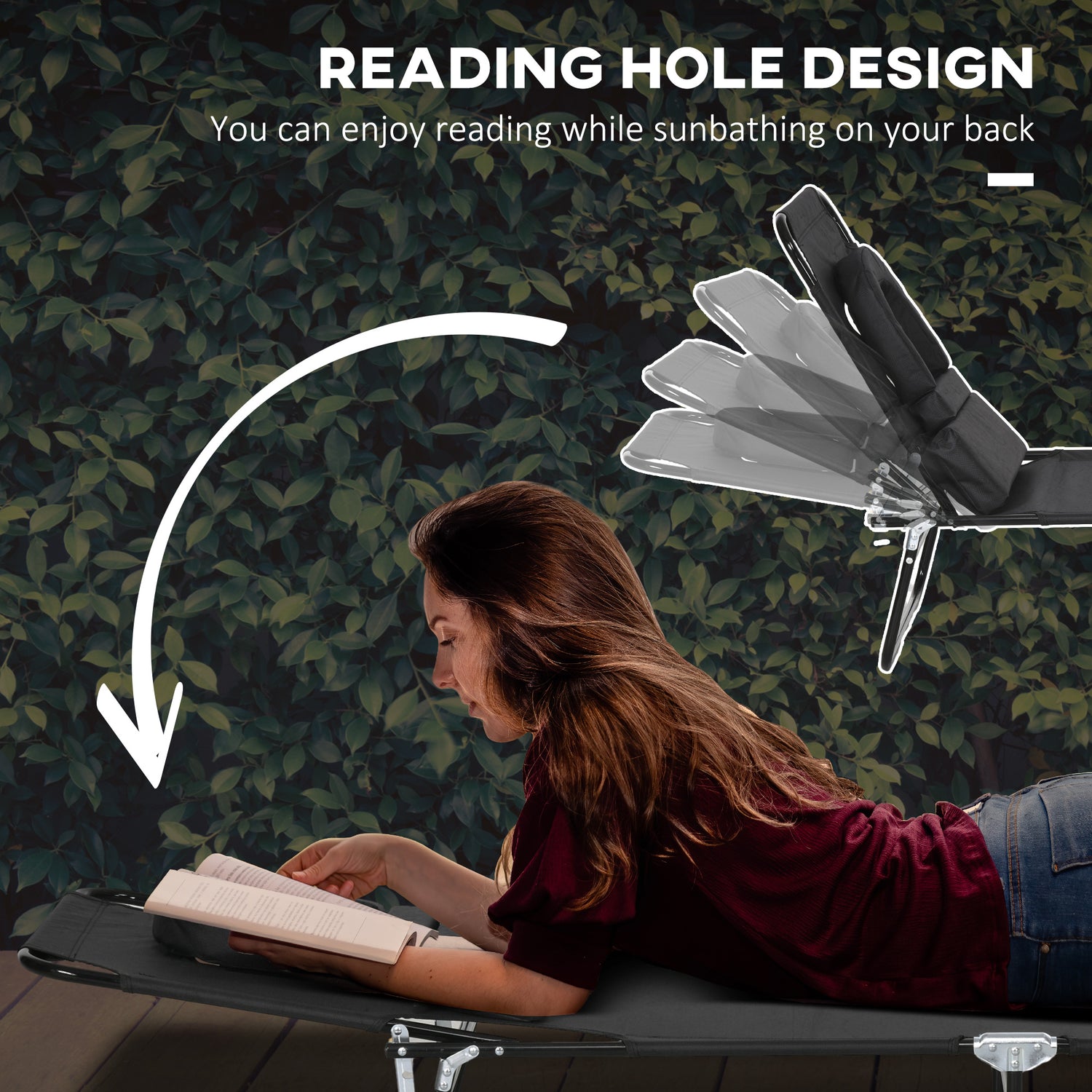 - Padded face hole: Massage table style design, gives your head a place to rest in - great for you when you're sunbathing on your front. The folding sun lounger is great for reading in your garden and outdoor area.