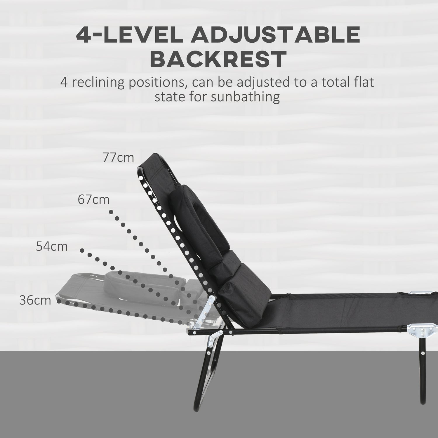 - Four-level adjustable back: Garden sun lounger can be locked to different positions - easy to lie back at an angle you like.