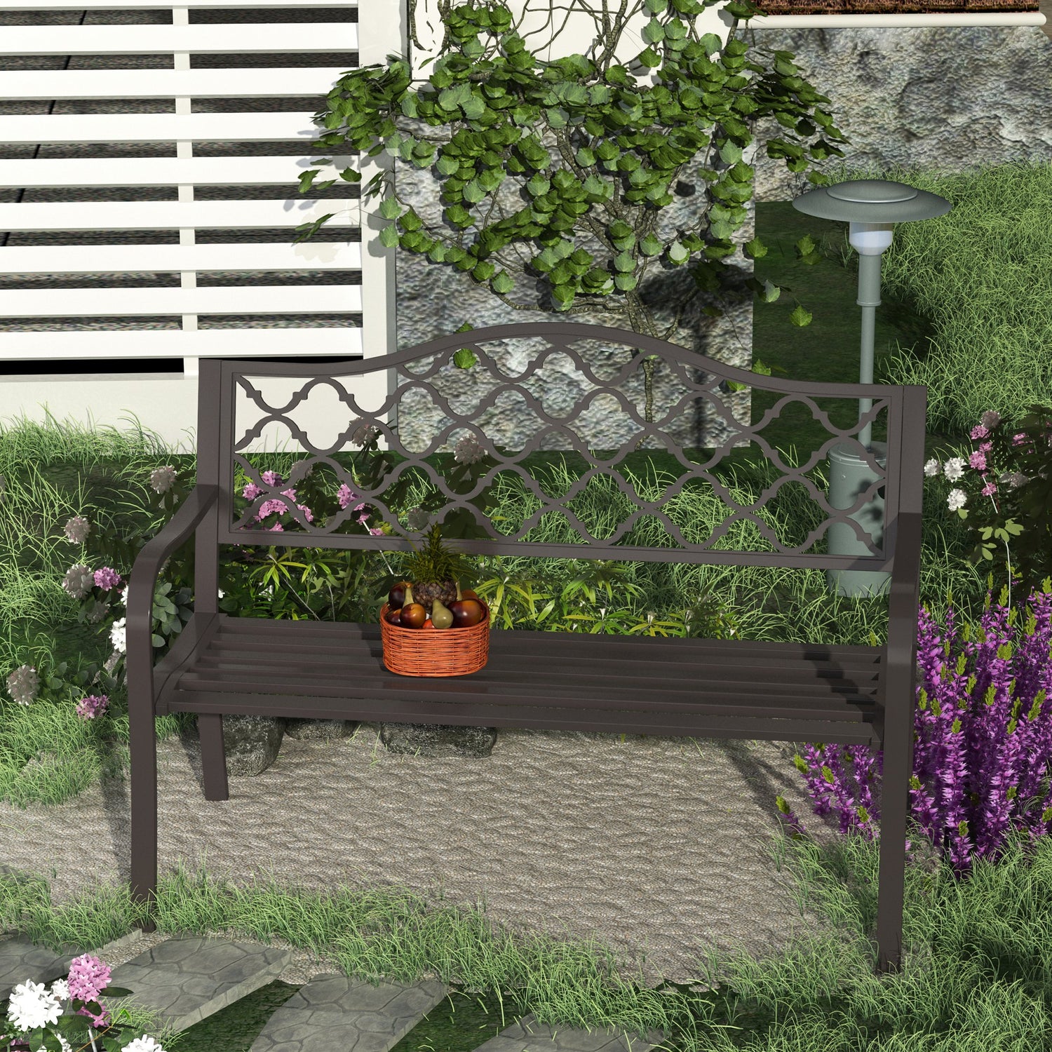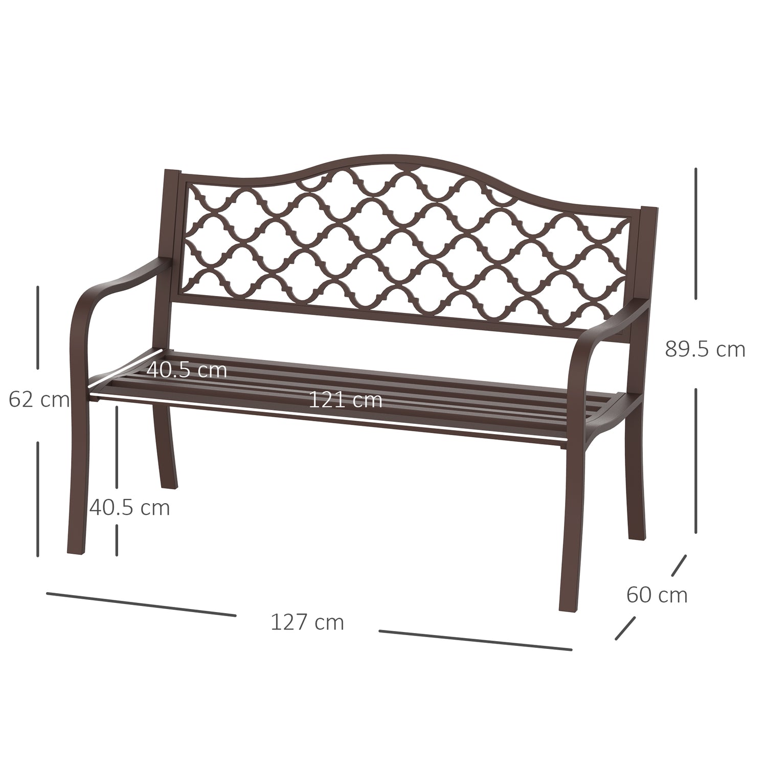 Take time to yourself or with some company - do it with this two-seater Outsunny bench. It's made from steel so it's tough - with a powder coating for protective strength. The seat is gently curved to work with your body shape better, with a high back and armrests for support. There's a cut-out pattern on the back for style and can be customised to how you want - weaving flowers and materials there as an idea. To keep looking its best, we recommend using a protective furniture cover.