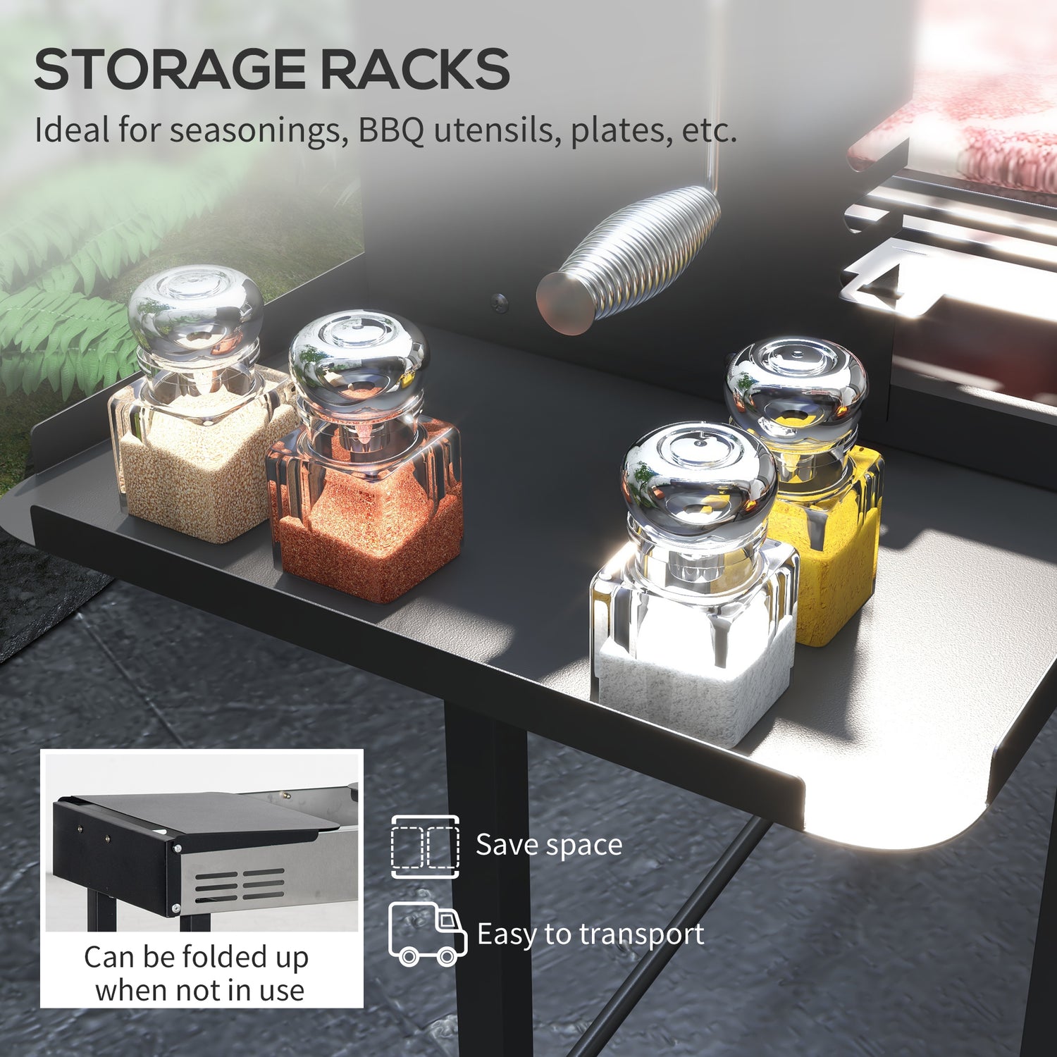 - SIDE SHELVES: Handy holding room - for plates, food, condiments and more. Folds up to save space when not needed.