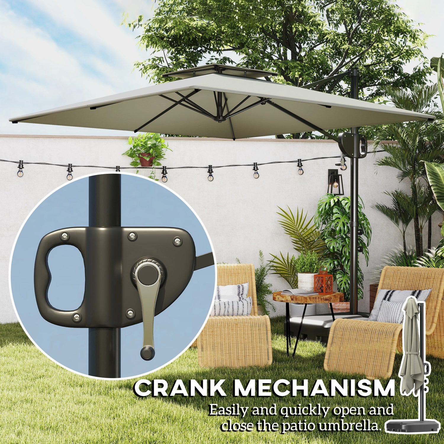 - Handy crank system: Easily and quickly open and close the cantilever patio umbrella using the handle on the powder-coated pole