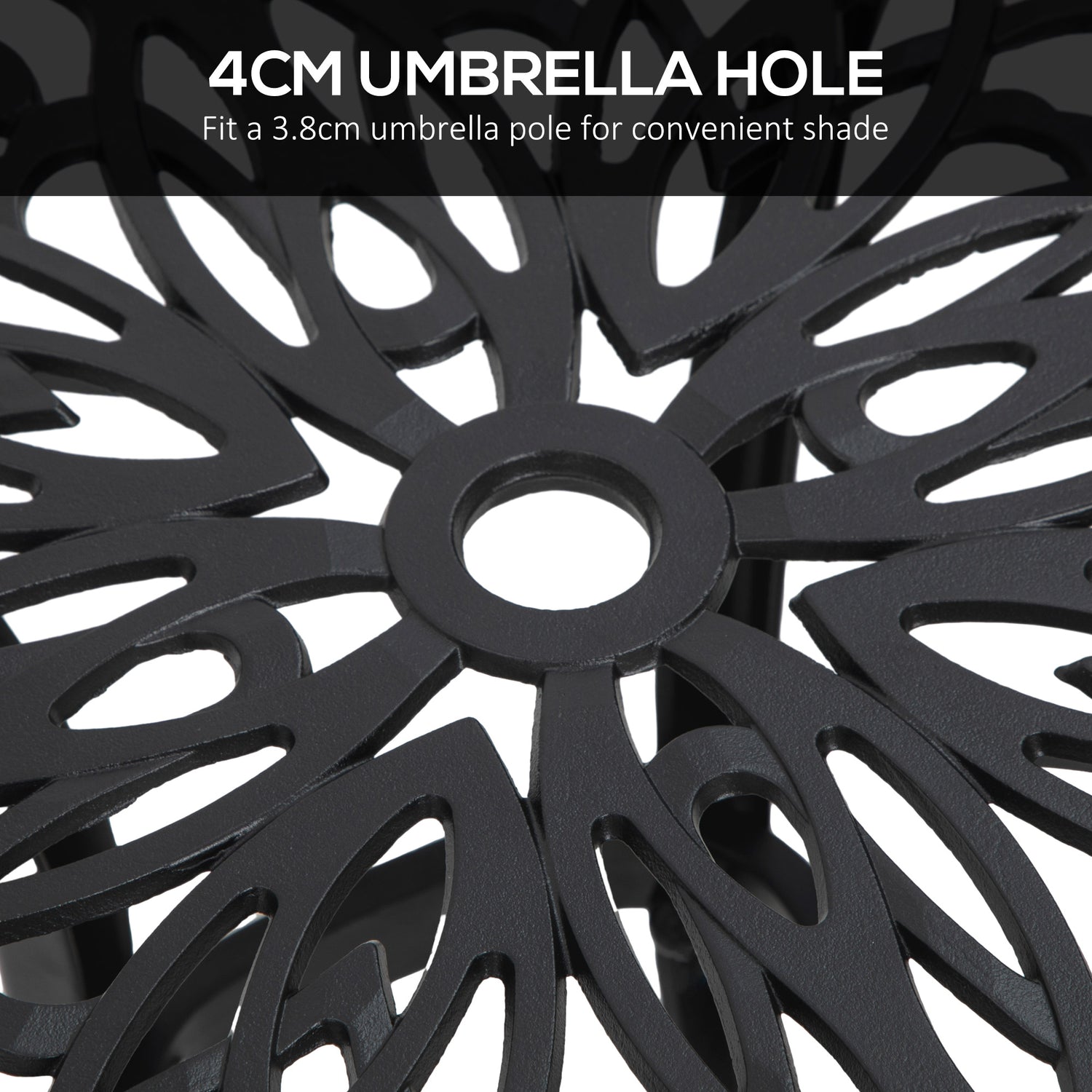 Enhance your outdoor with this Outsunny bistro table. Comes with a floral cut-out tabletop with curved legs for a beautiful design. Made from cast aluminium frame, with a powder coated finish, this is a strong outdoor coffee table suitable for year-round year. Comes with a Ø3.55 cm central hole to hold parasol in place.