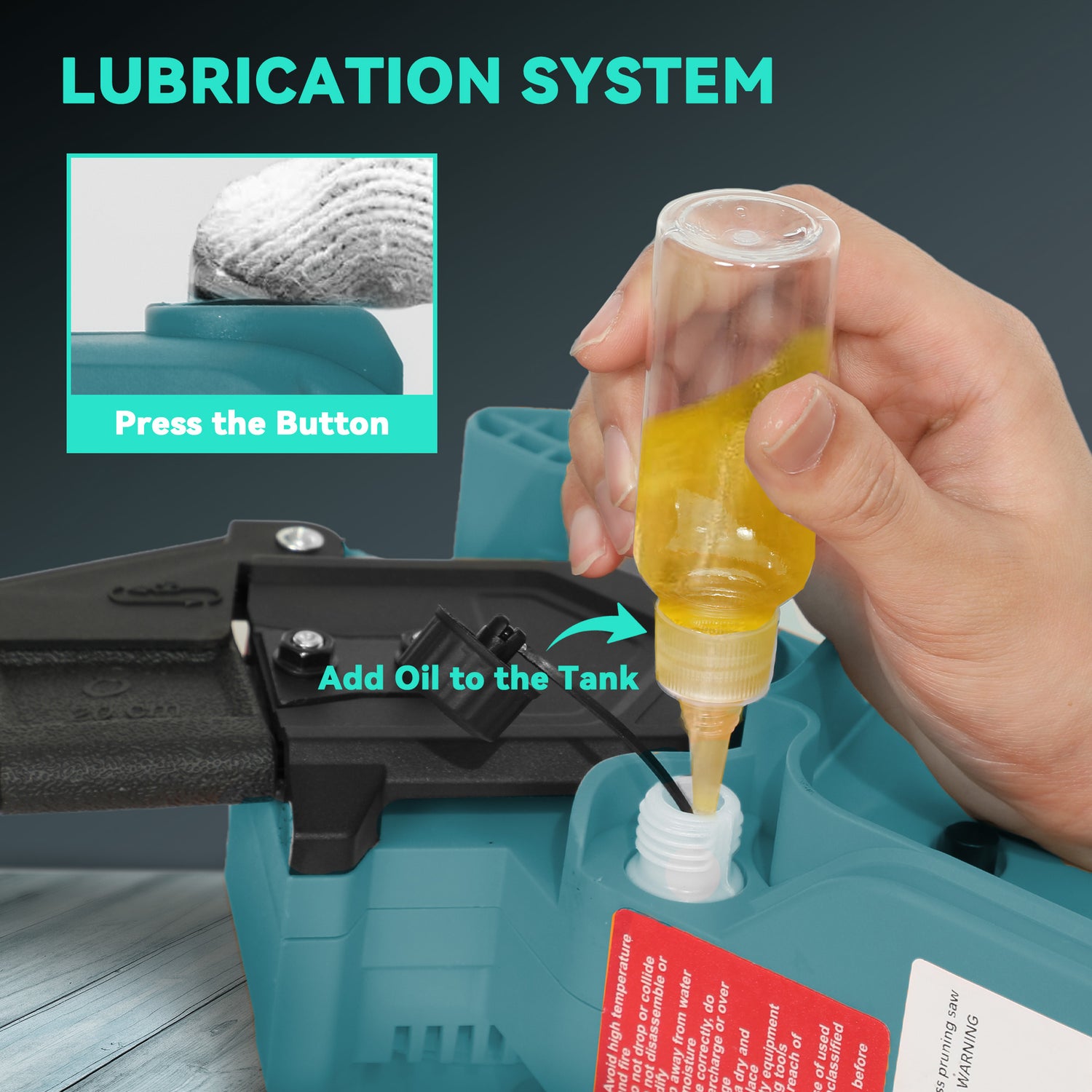 - Efficient lubrication system: Keep your battery chainsaw running smoothly with the semi-automatic oiling system. Simply add oil to the tank using the oil bottle, press a button and let it self-lubricate for reduced friction and effortless cutting!