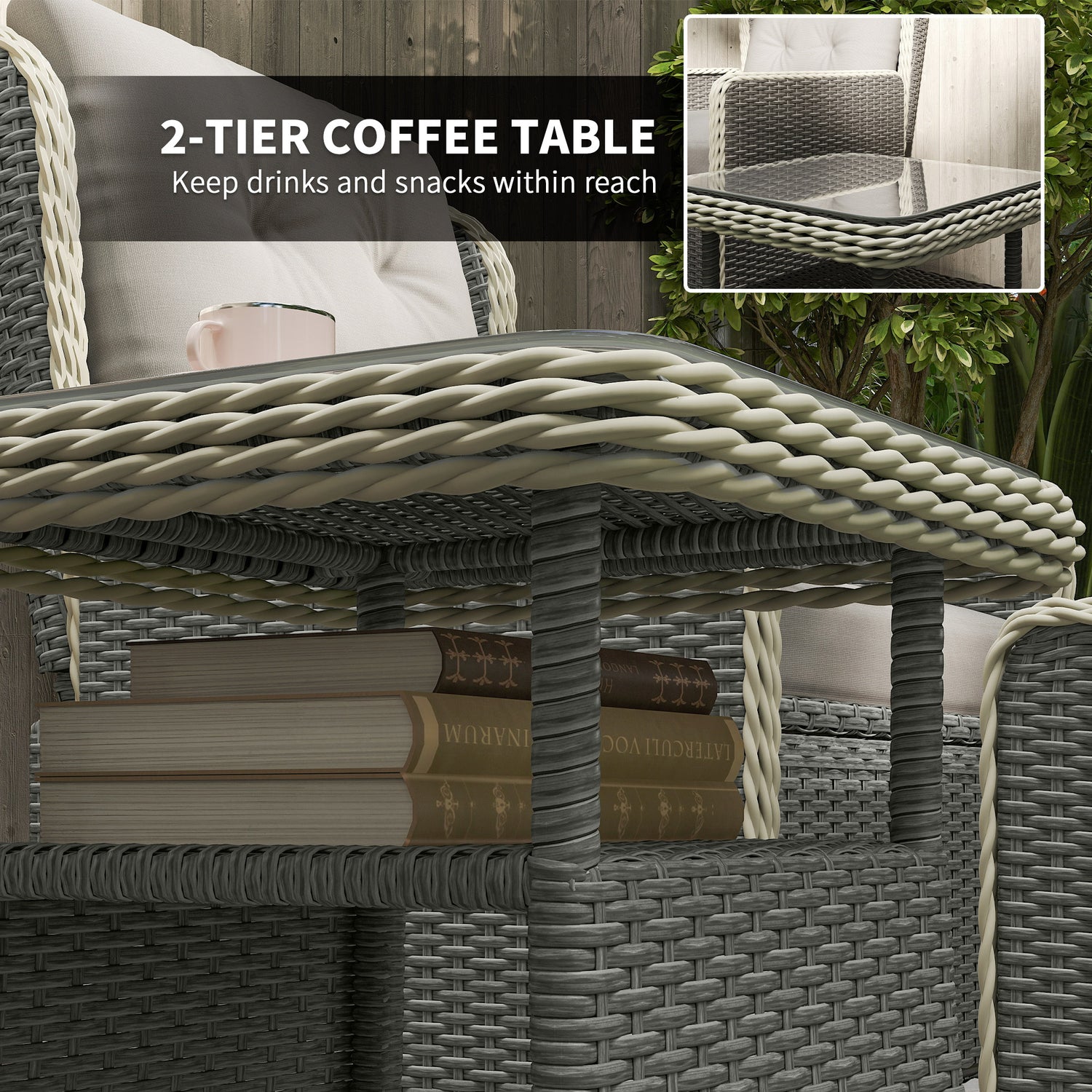 This Outsunny outdoor furniture set comes with two reclining chairs, two footstools and a two-tier coffee table. The footstools with slight sloped top are designed for ergonomic leg support. Set the chair backs to a maximum 150° angle - lie back to the position you want, with the padded cushions providing plenty of comfort. The garden furniture set is complete with a tempered glass tabletop on the two-tier table.