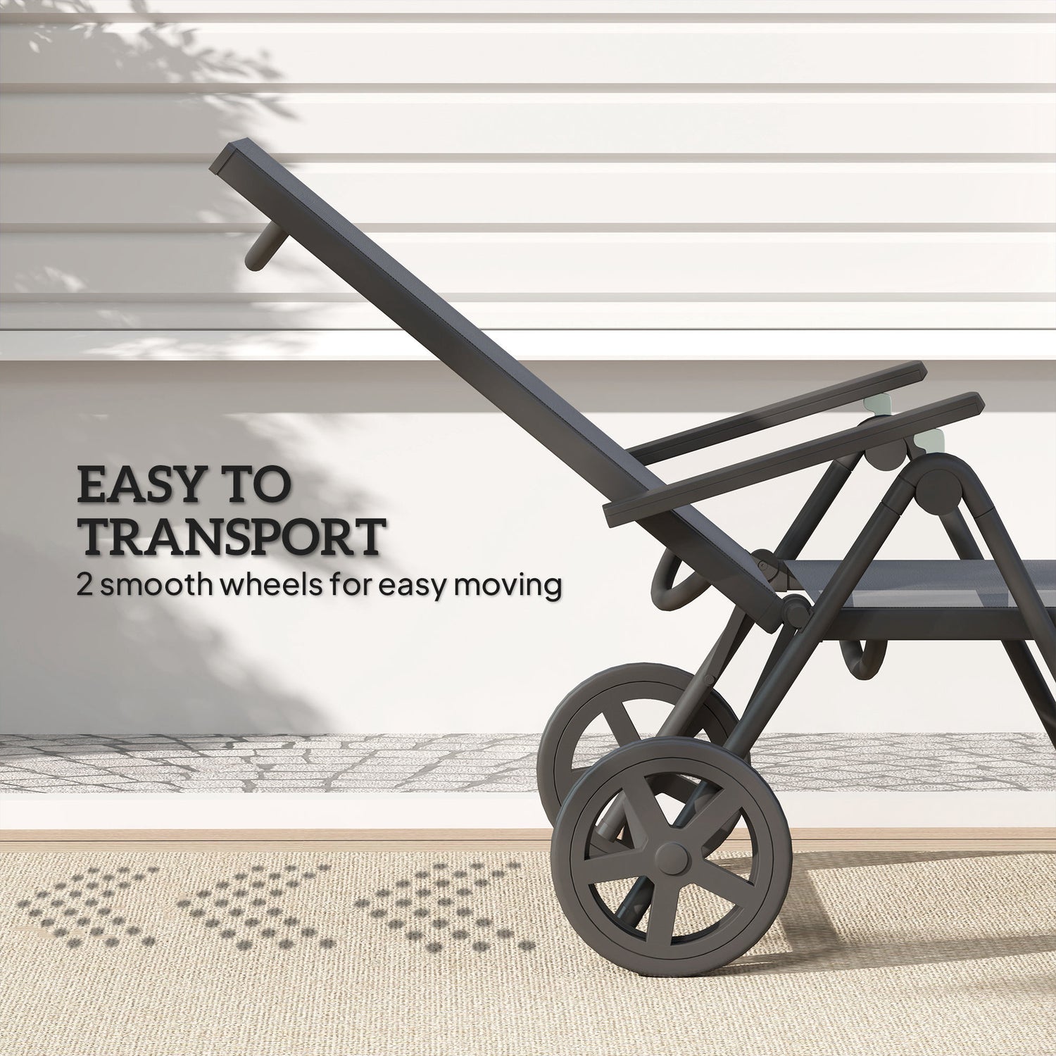 - Foldable design with wheels: Equipped with two smooth wheels, this foldable sun lounger is easy to transport and store, great for home use, travel, or beach trips—take it wherever relaxation calls.