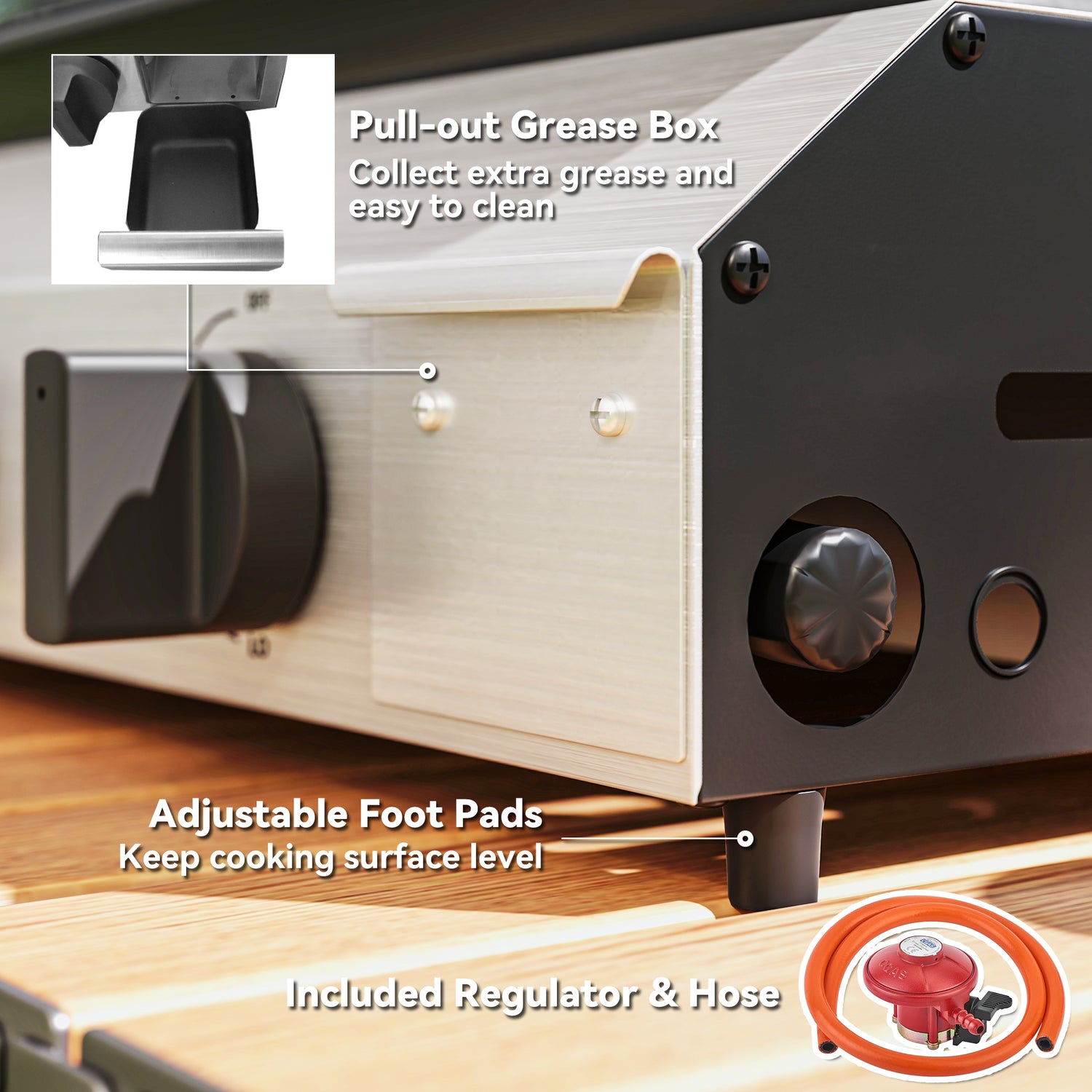 - Small, compact size: Carry tabletop gas bbq with you almost anywhere, suitable for taking to friend's gardens, outdoor events and similar parties/gatherings. Adjustable feet to keep grill balanced at all times.