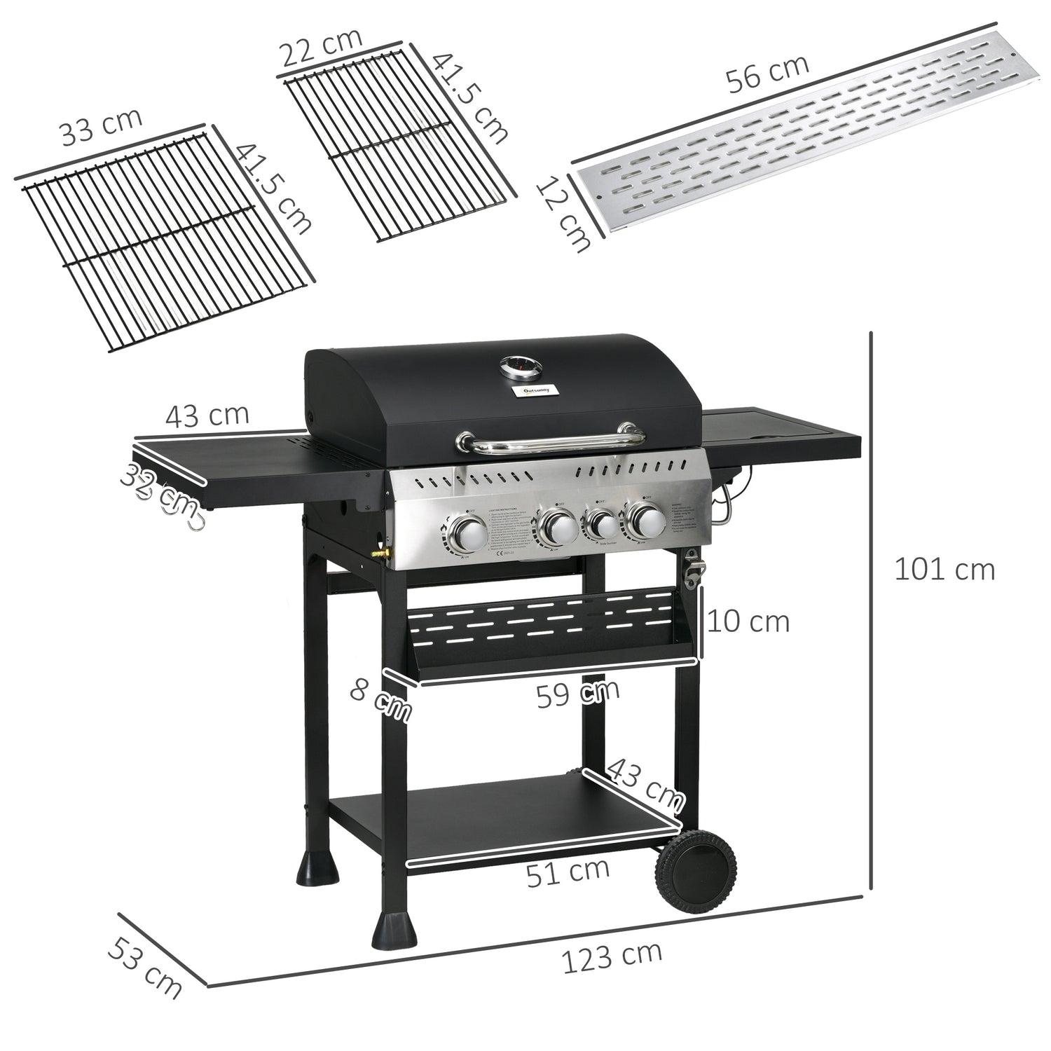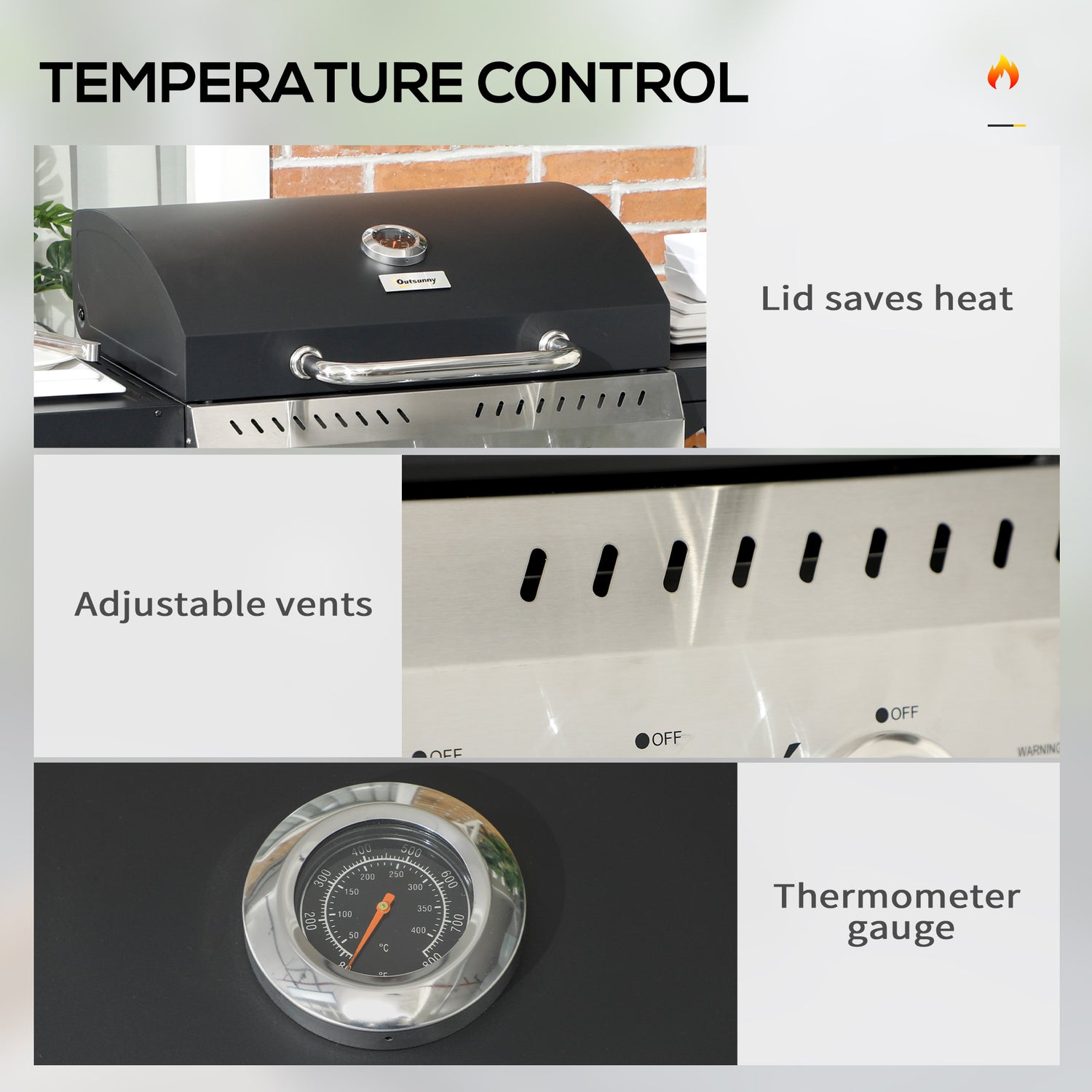 Outsunny Galvanised Steel 3+1 Gas Burner BBQ Grill Trolley, Black