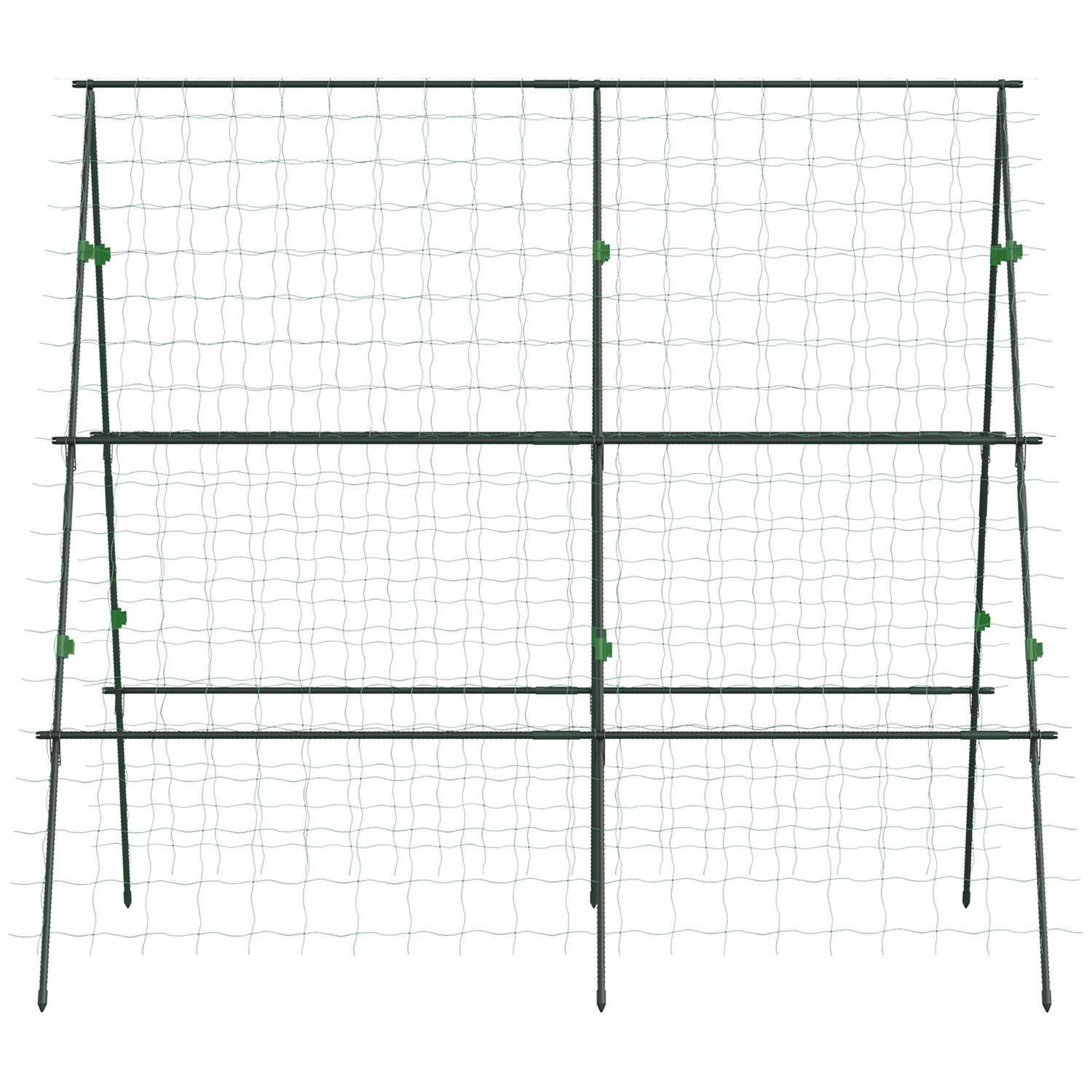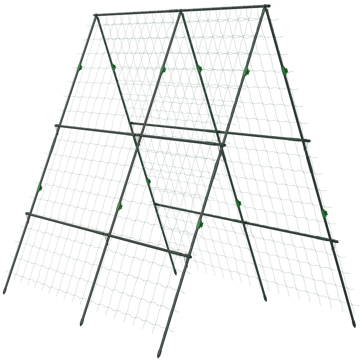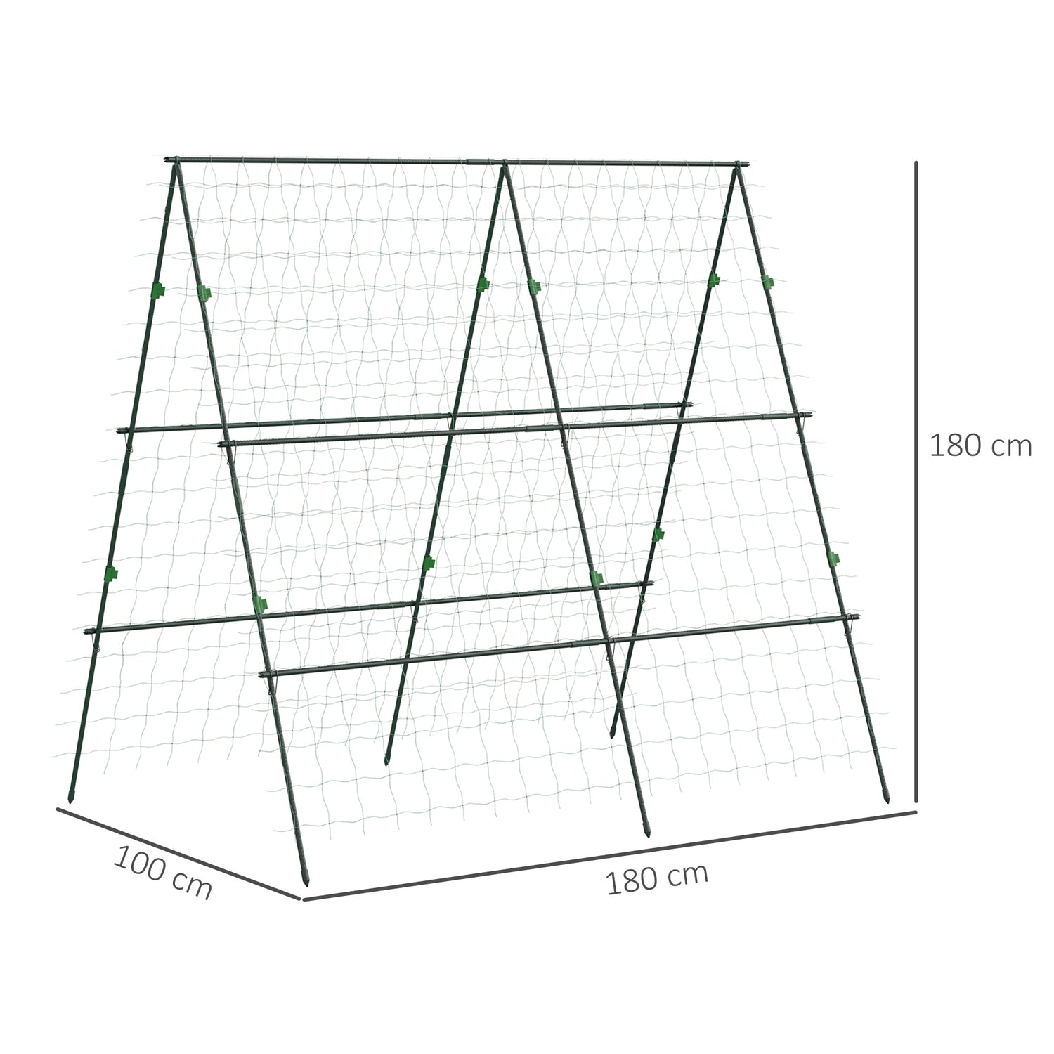 - Robust & weather-resistant: Built with powder-coated steel pipes and PE-coated for extra protection. Our cucumber trellis comes with 12 metal clips for easy assembly. The pointed feet anchor securely into the ground, ensuring long-lasting stability.