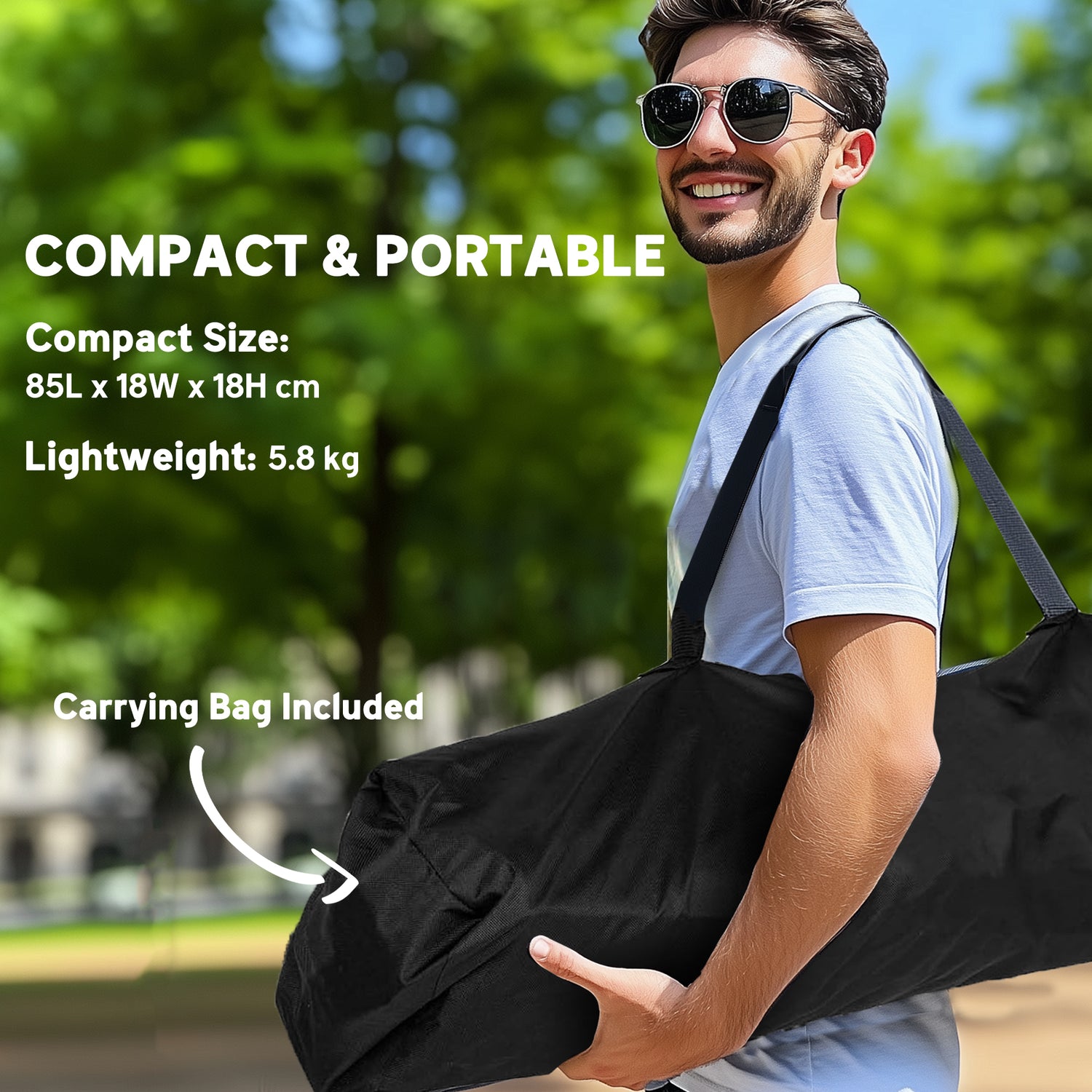 - Compact & Portable: Simplifying travel, this lightweight camping chair features an easy fold system, reducing to a compact size (85 x 18 x 18 cm) with a lightweight frame of 5.8 kg and comes with a carrying bag.