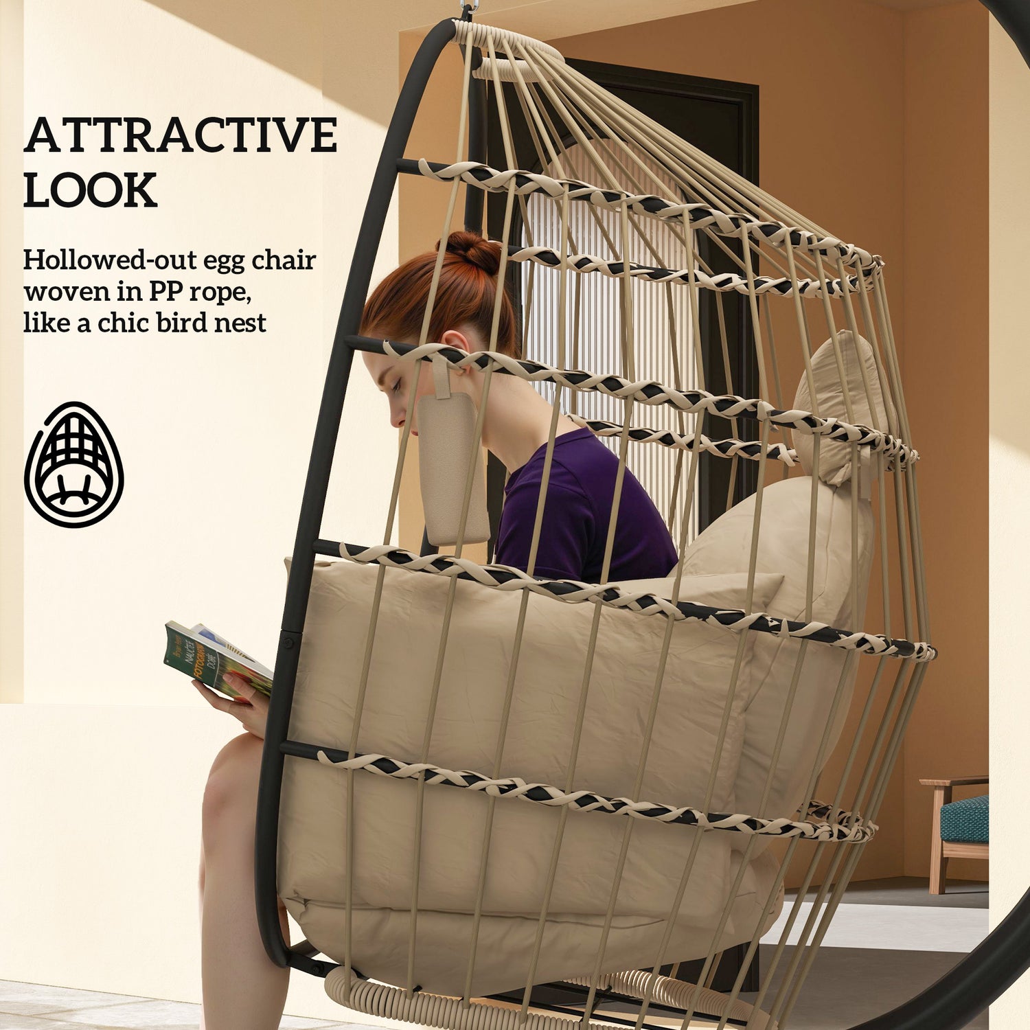 Relax in optimal comfort with this outdoor egg chair from Outsunny! This egg garden chair with a hollowed-out design woven in ropes is like a cosy bird-nest retreat. The folding basket allows easy storage, with a cup holder keeping your drink close. 20cm thickened cushion with armrests and a separate head pillow offer luxurious comfort. Powder-coated steel frame and X-shape base mean a stable swinging egg chair. Adjustable top chain customises your swinging experience.