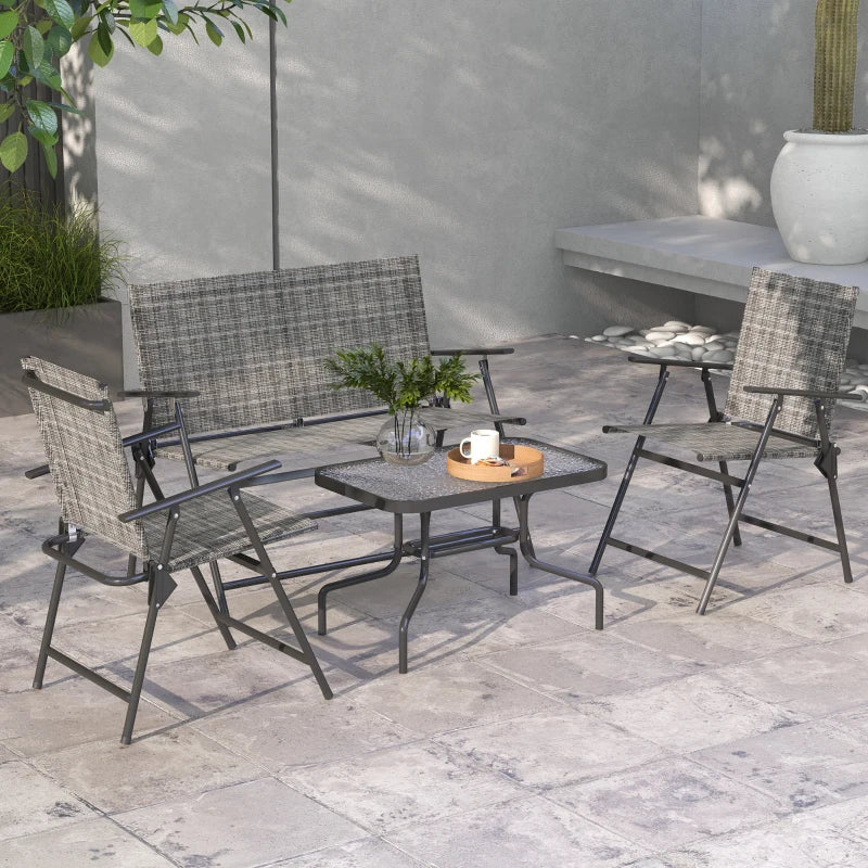 This outdoor furniture set from Outsunny is a four piece of decor in any corner of any room in your home. Made of a steel frame and wrapped breathable mesh fabric ensures lasting durability. The table has tempered glass for stable refreshment placement and backrests offer optimal comfort. The Outsunny 4 piece garden furniture set is essential for any garden or patio setting to complete a look in comfort and style.
