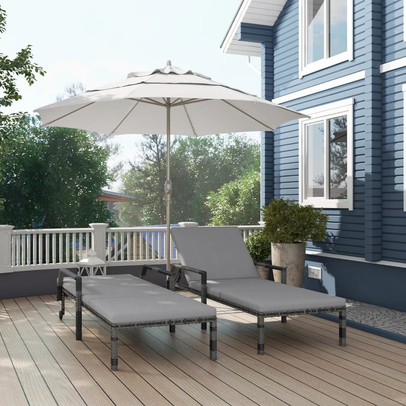 Outsunny Outdoor PE Rattan Sun Lounger Set of 2, Wicker Chaise Recliner Garden Chair with 5-Level Adjustable Backrest and 2 Wheels, Grey