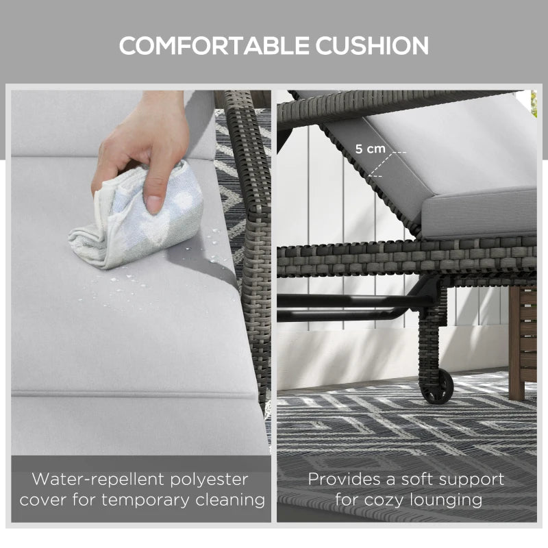 This Outsunny sun lounger set is great for all-day relaxing. With a longline padded cushion and five-position back, this is a comfortable piece that can be customised to your choice. A metal frame for a strong core, wrapped in plastic wicker - protecting the metal whilst creating a stylish garden look. Complete with wheels to move around easily.